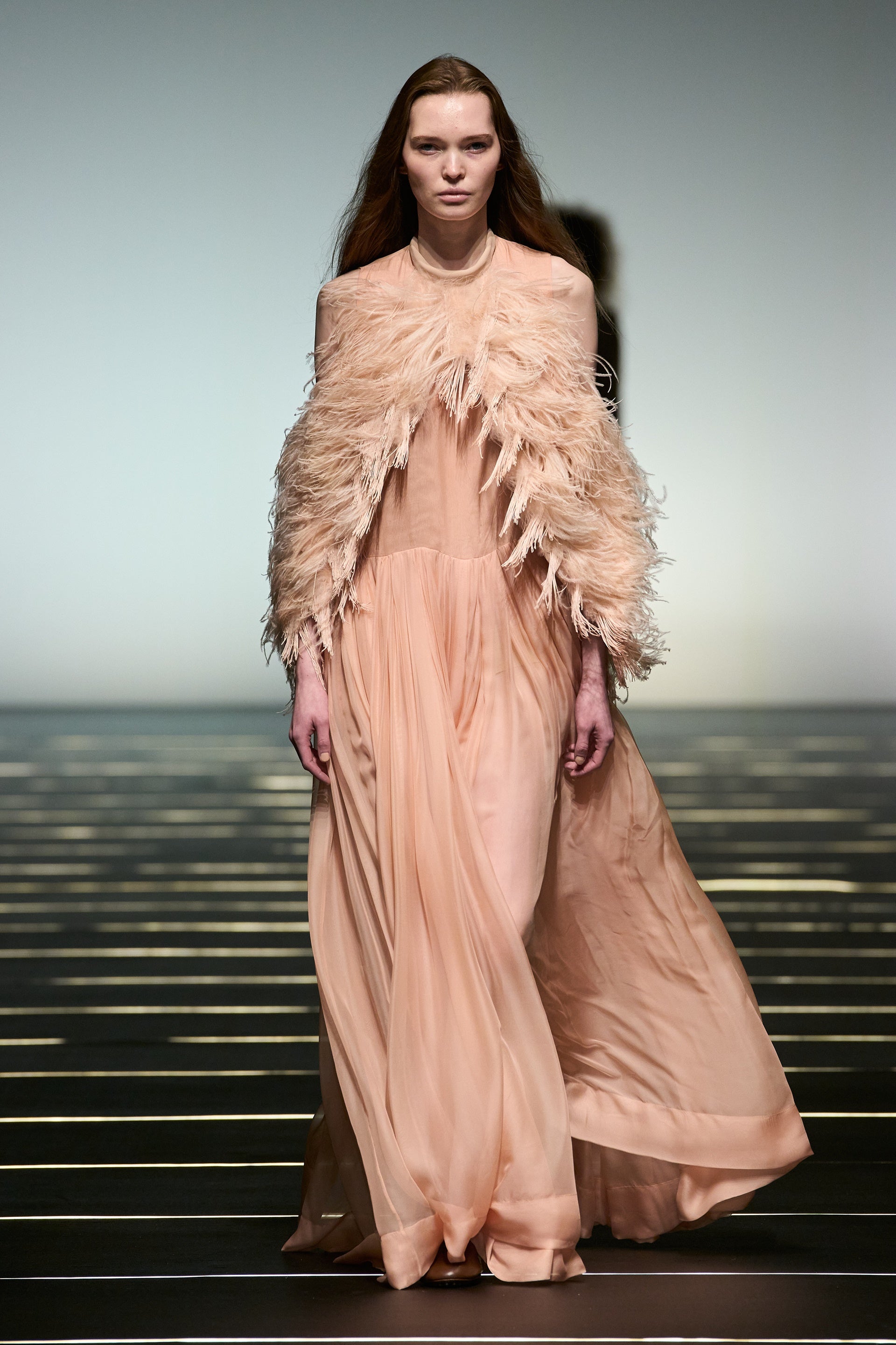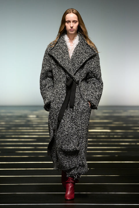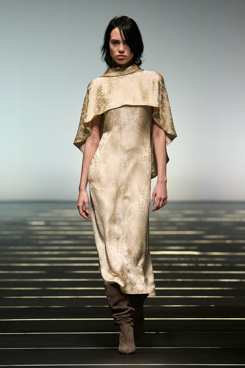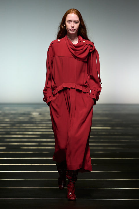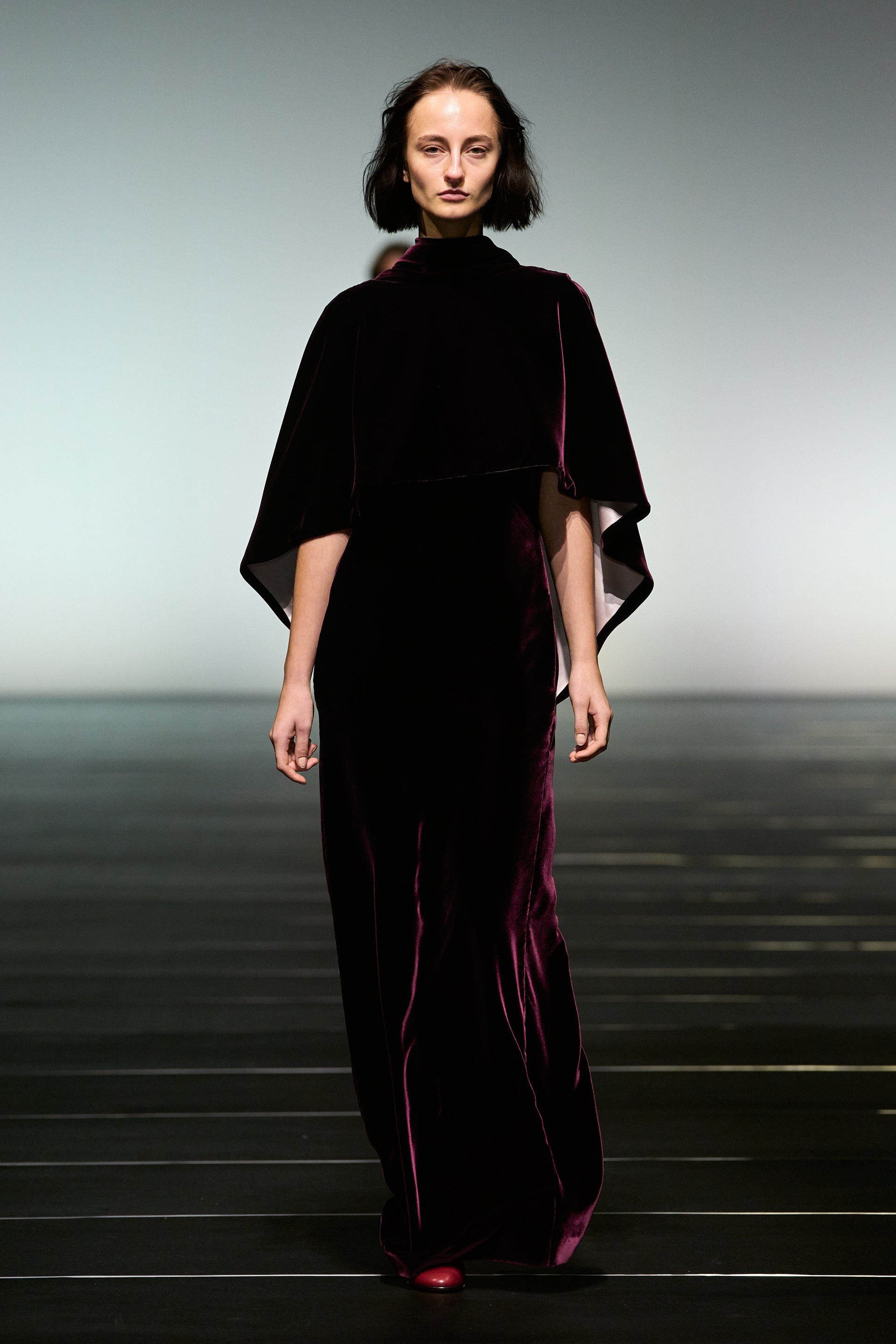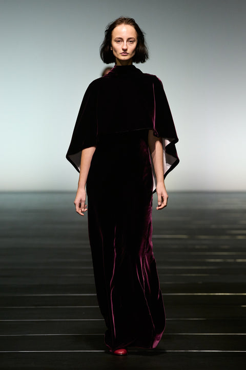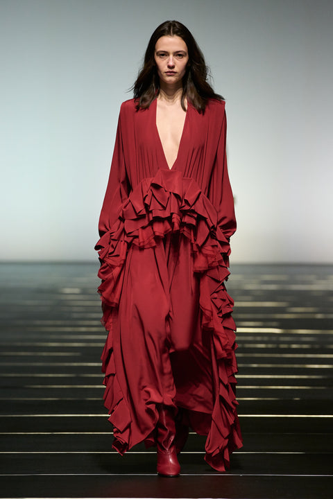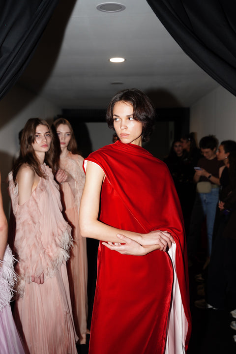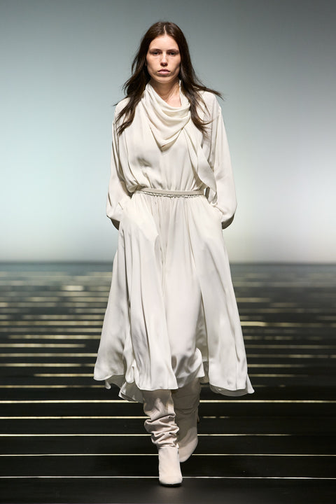 La couleur se décline dans des nuances profondes de noir, ivoire, rubis et aubergine, apportant richesse aux silhouettes façonnées autant par le confort que par l’occasion. Des bottes slouchy et des ballerines plates accompagnent les robes, ancrant le drapé sculptural. Le soir se déploie dans des silhouettes discrètes en velours avec cape, avec des accents occasionnels de plumes d’autruche. Les perles apparaissent sous forme de légères broderies tubulaires sur des pièces séparées — y compris pantalons, hauts et costumes adoucis — créant un scintillement fluide et réfléchissant.