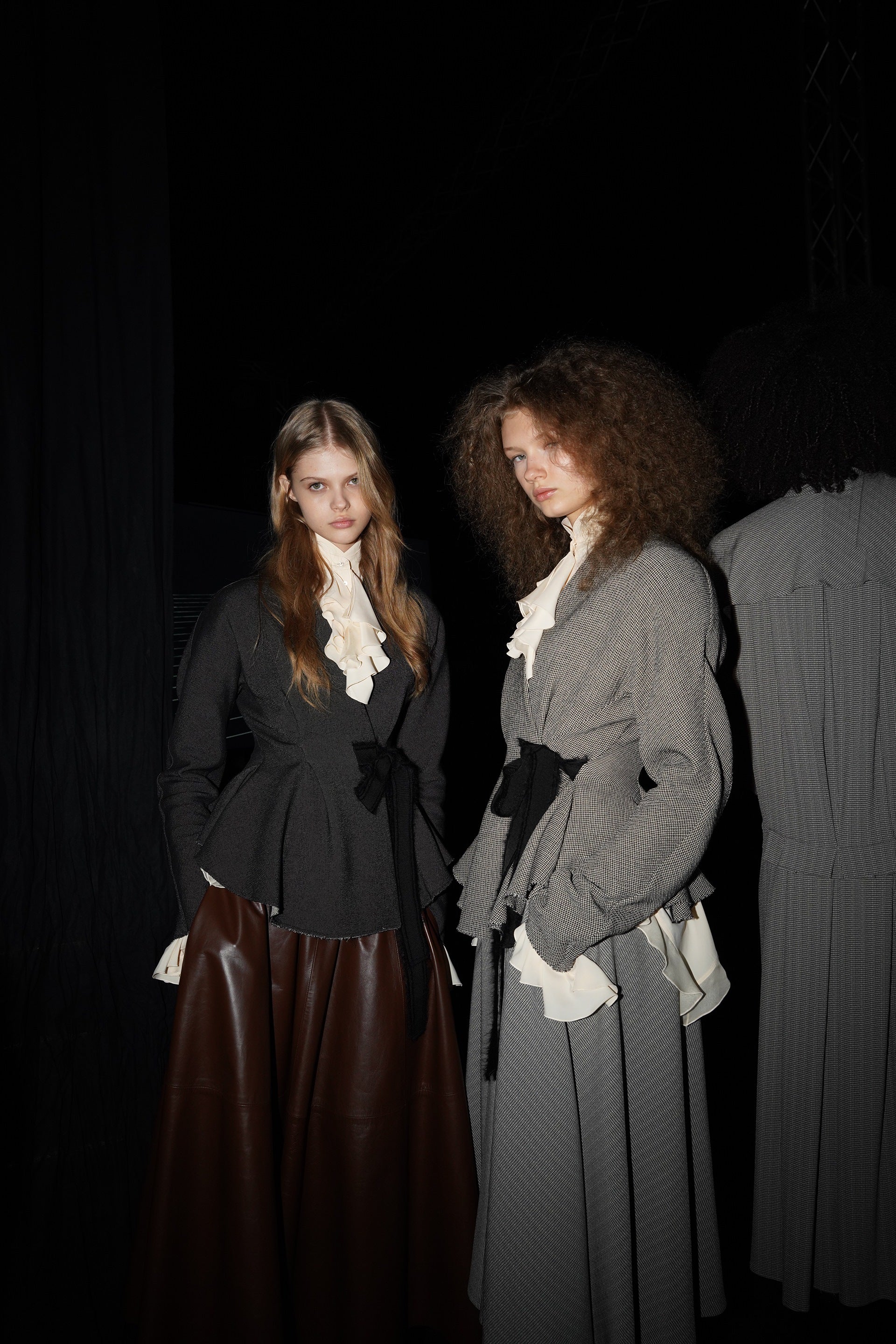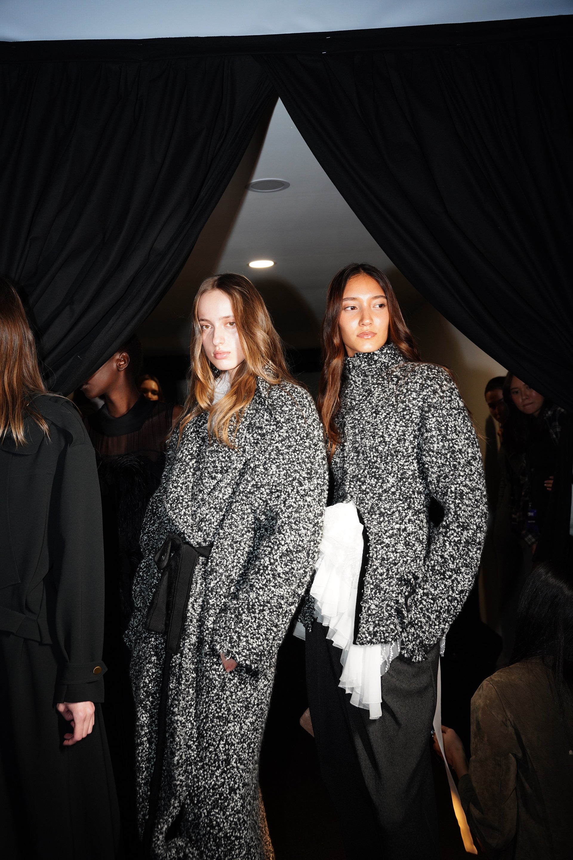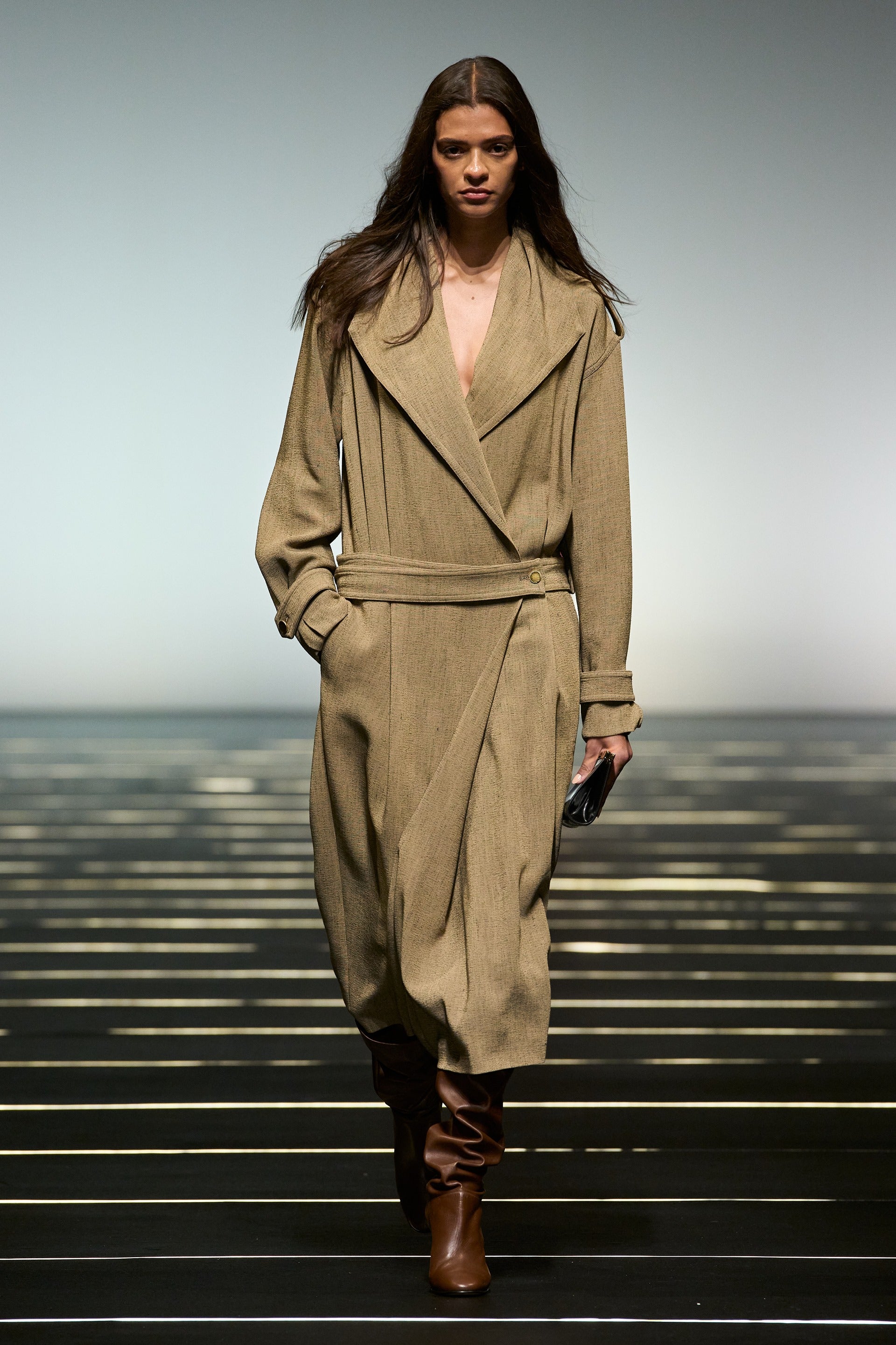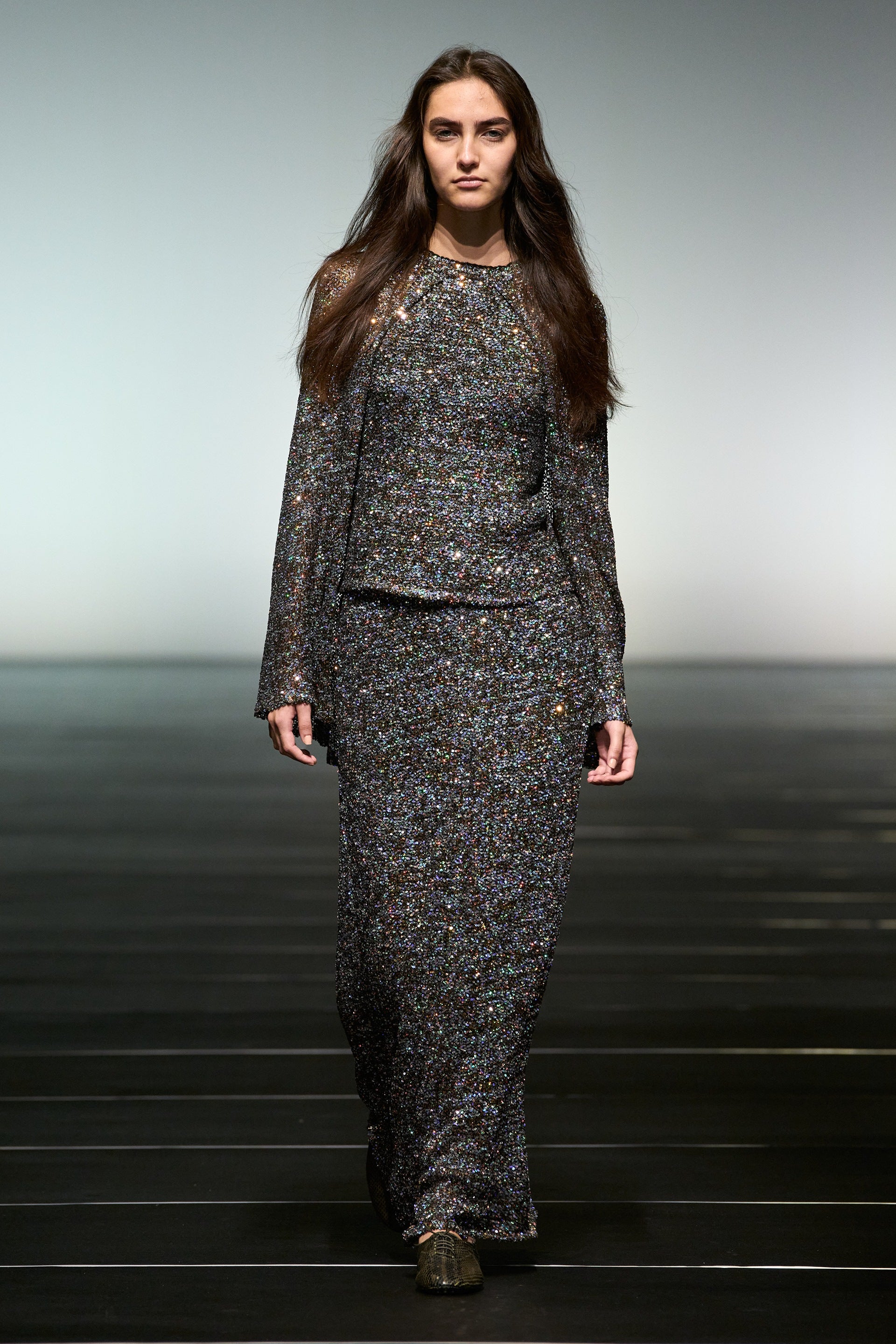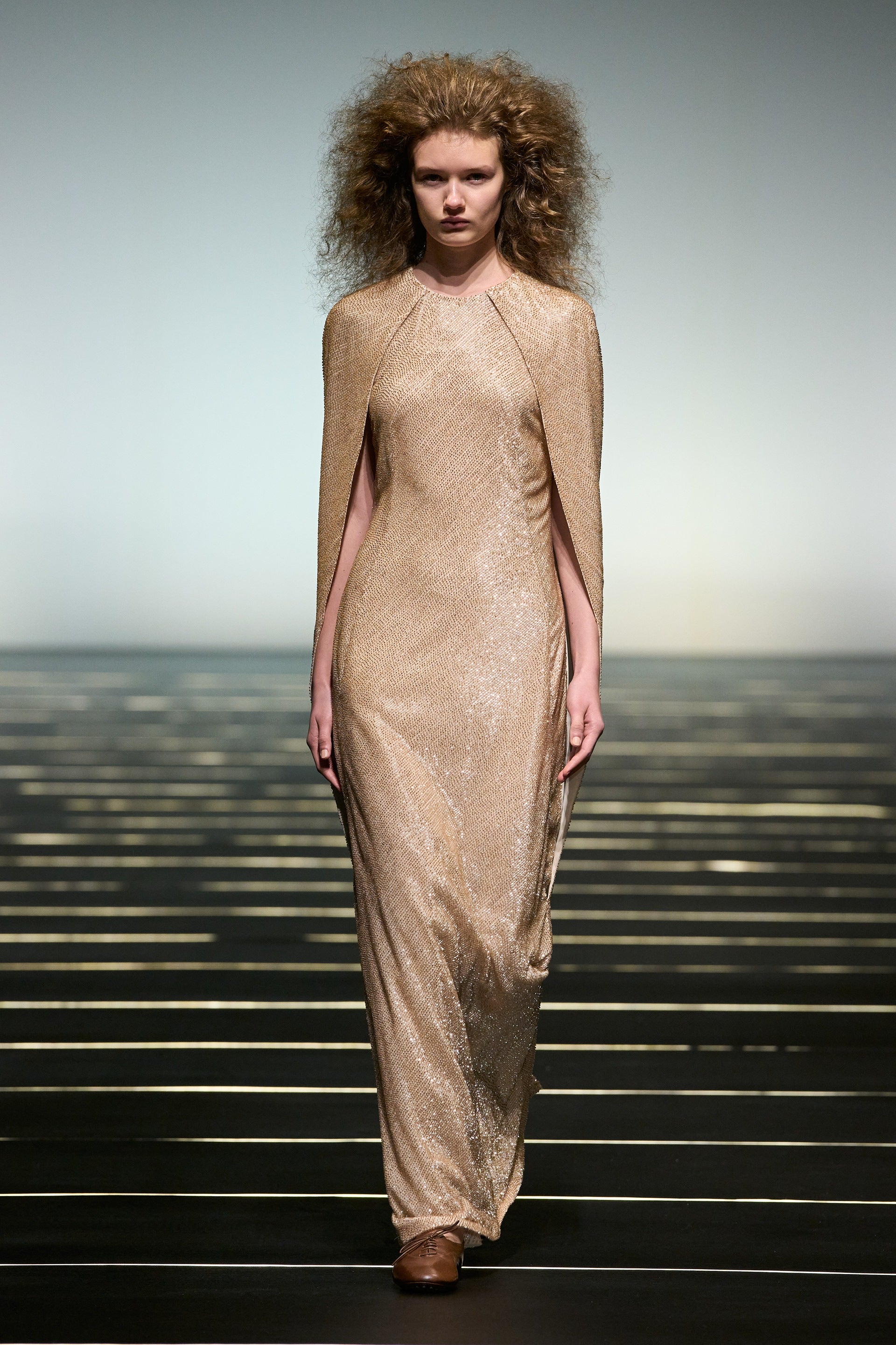 La couleur se décline dans des nuances profondes de noir, ivoire, rubis et aubergine, apportant richesse aux silhouettes façonnées autant par le confort que par l’occasion. Des bottes slouchy et des ballerines plates accompagnent les robes, ancrant le drapé sculptural. Le soir se déploie dans des silhouettes discrètes en velours avec cape, avec des accents occasionnels de plumes d’autruche. Les perles apparaissent sous forme de légères broderies tubulaires sur des pièces séparées — y compris pantalons, hauts et costumes adoucis — créant un scintillement fluide et réfléchissant.