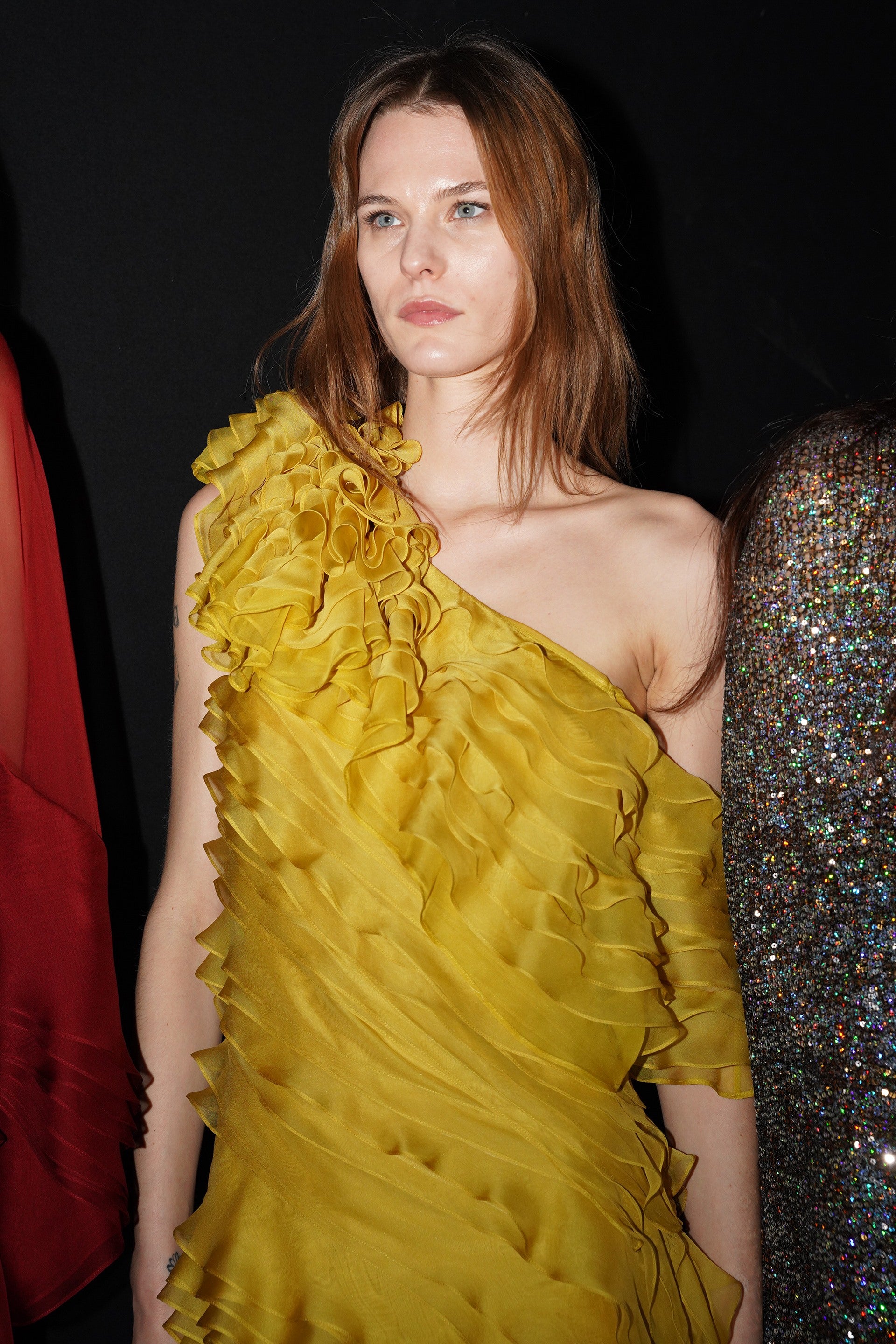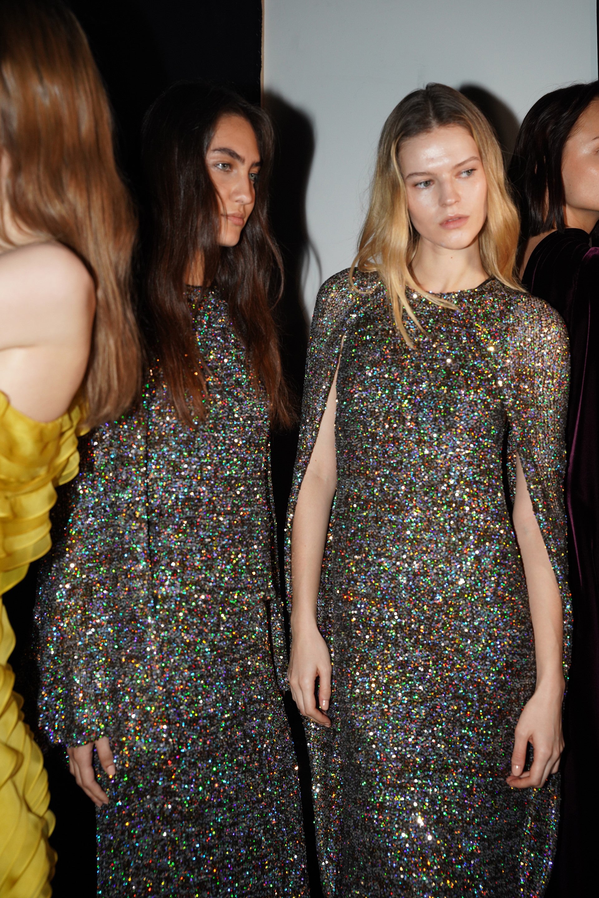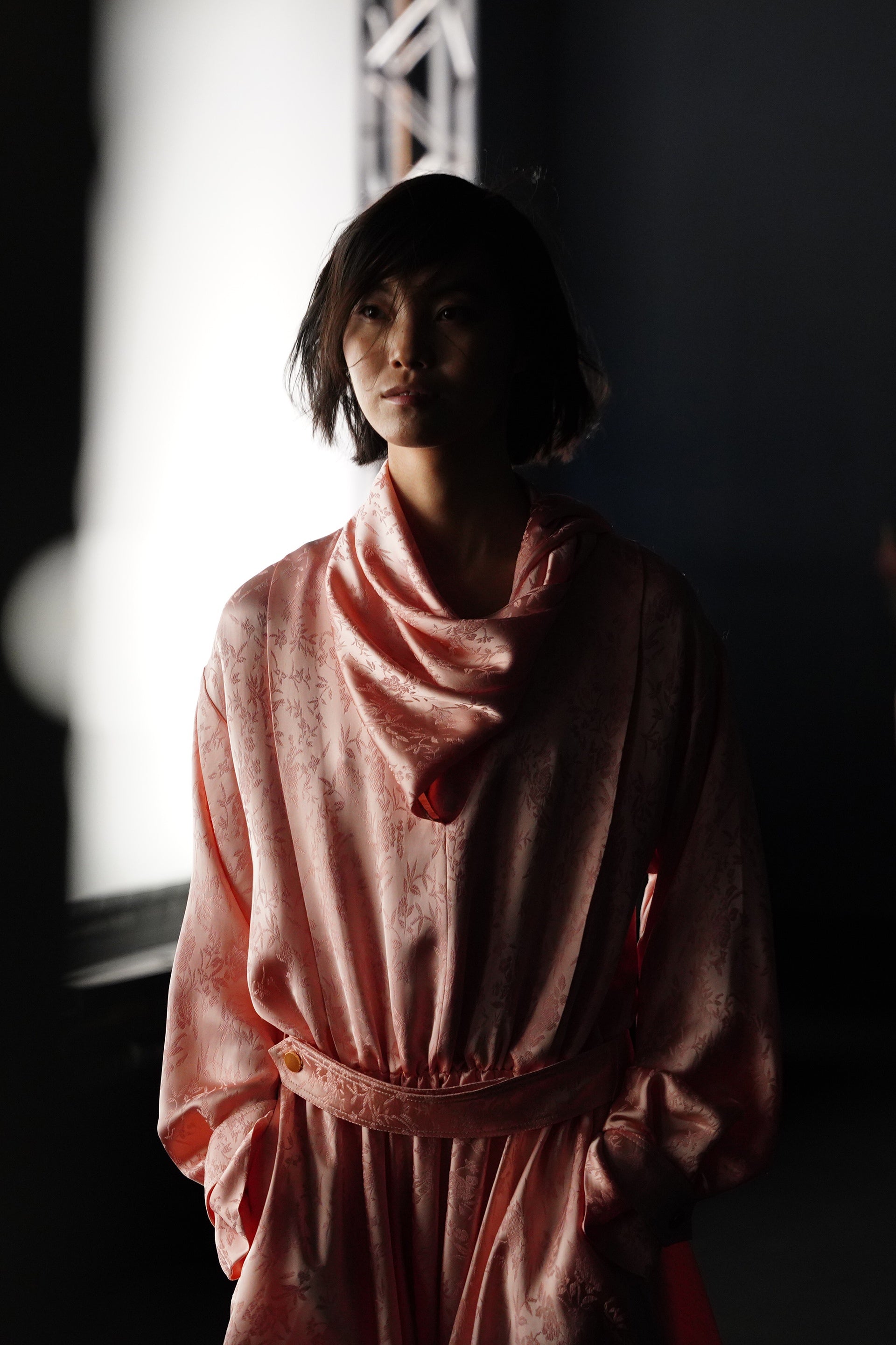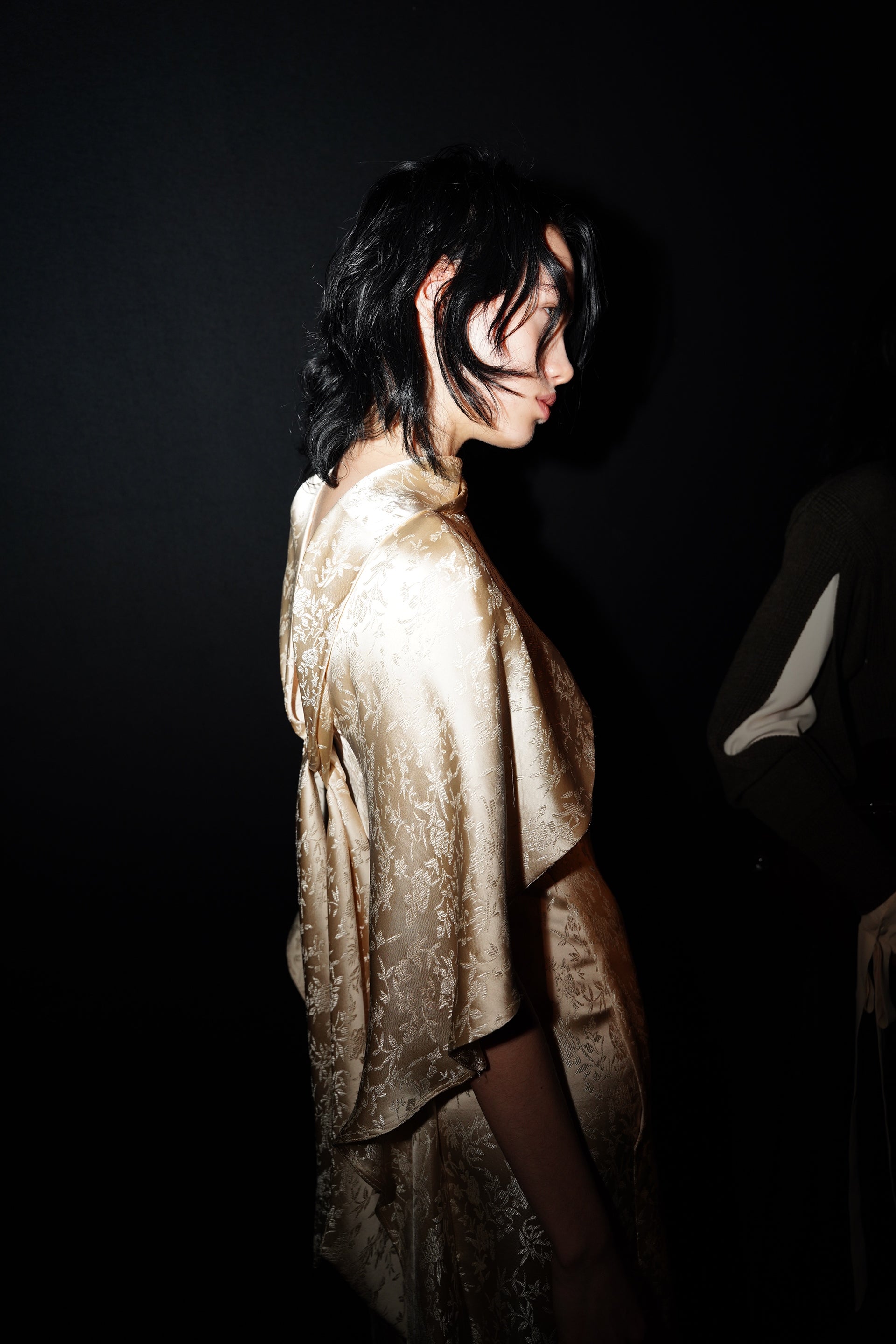 La couleur se décline dans des nuances profondes de noir, ivoire, rubis et aubergine, apportant richesse aux silhouettes façonnées autant par le confort que par l’occasion. Des bottes slouchy et des ballerines plates accompagnent les robes, ancrant le drapé sculptural. Le soir se déploie dans des silhouettes discrètes en velours avec cape, avec des accents occasionnels de plumes d’autruche. Les perles apparaissent sous forme de légères broderies tubulaires sur des pièces séparées — y compris pantalons, hauts et costumes adoucis — créant un scintillement fluide et réfléchissant.
