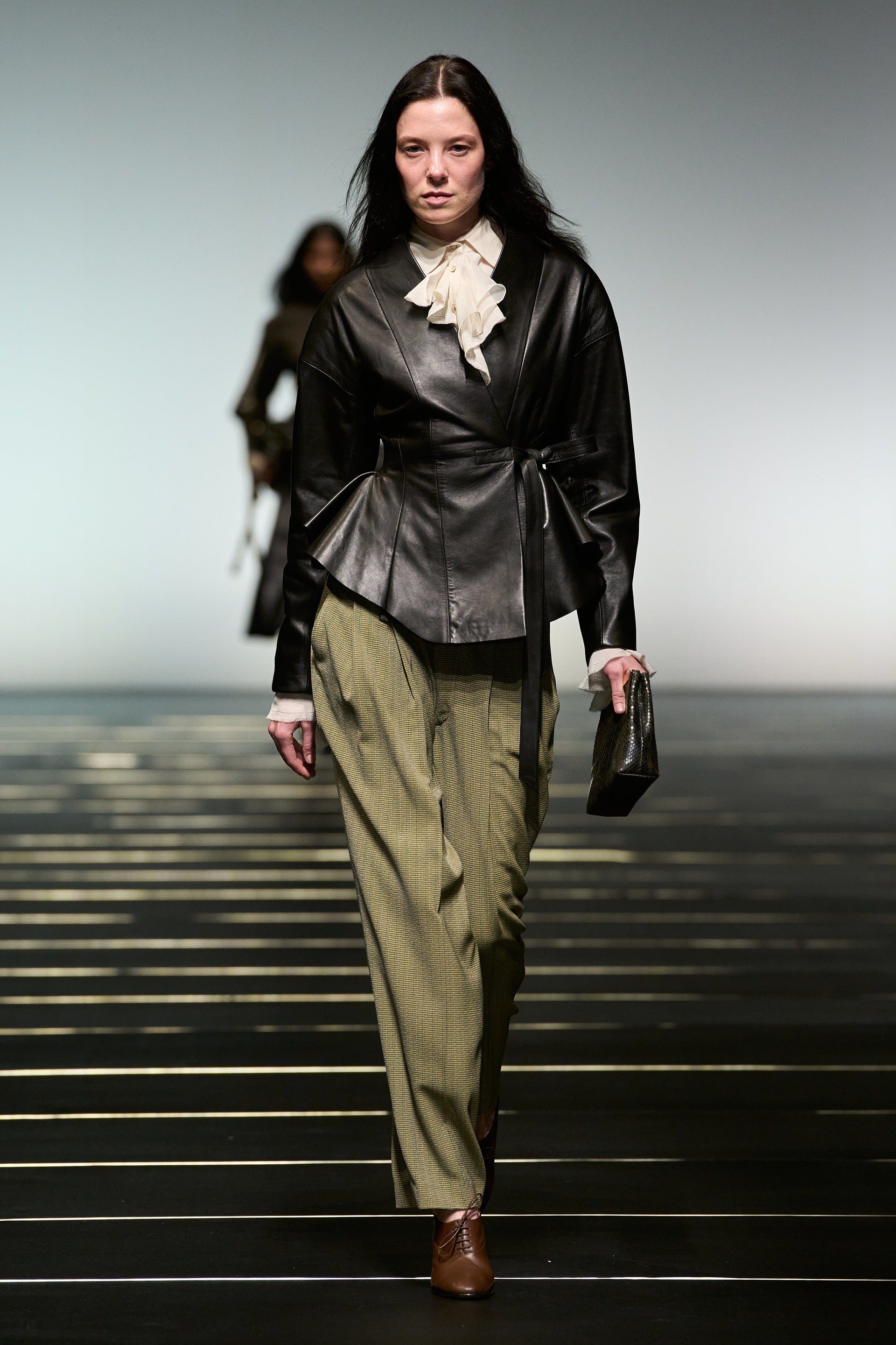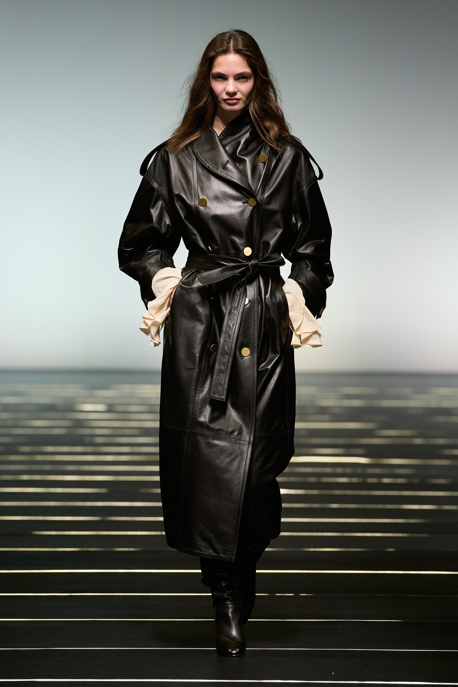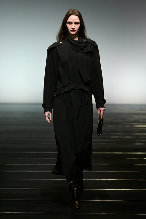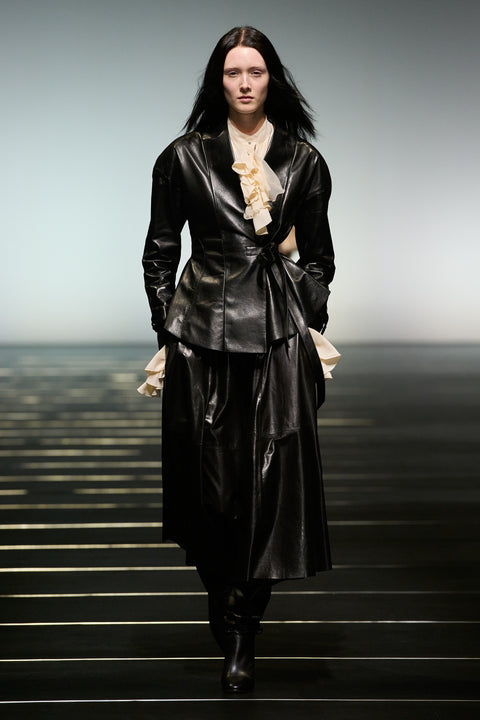 Les détails du trench sont reformés en robes avec épaulettes et rabats, tandis que le tulle est associé au cuir pour renforcer le dialogue entre fragilité et structure. La jupe occupe un rôle central dans la collection, s’affirmant comme une alternative fluide et expressive au pantalon.