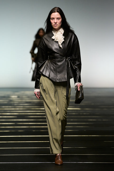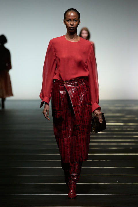Le cuir et la tailleur féminin ancrent la garde-robe avec clarté et intention, tempérant le romantisme par le pragmatisme. De cet équilibre, Alberta Ferretti développe un langage vestimentaire qui place celle qui porte le vêtement avant celle ou celui qui l’observe. Les cuirs d’agneau et d’anguille, sublimés par de subtils traitements effet shibori, prennent forme en jupes et manteaux, adoucissant les codes établis du power dressing par la retenue et la fluidité.