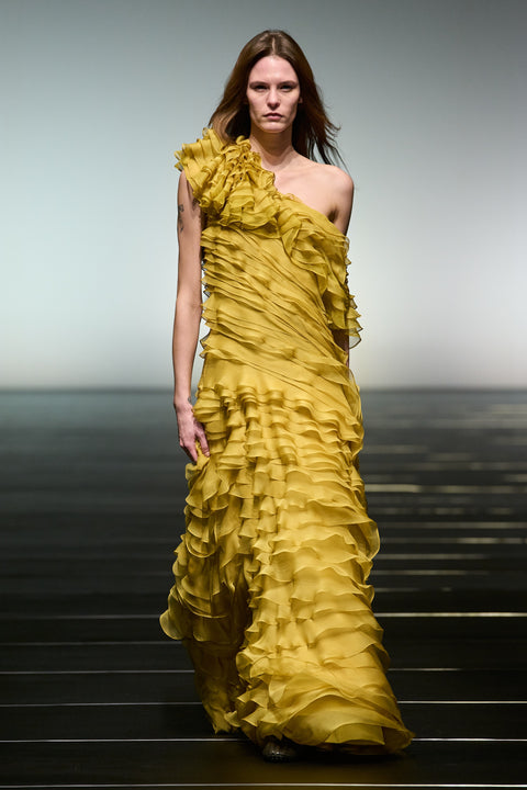 « Ce que j’apprends de la femme Alberta Ferretti, c’est que, plus que toute autre considération, elle s’habille avant tout pour elle-même. Son pouvoir n’a pas besoin d’être affirmé ou exhibé. Il est intérieur, instinctif : une manière de s’habiller qui amplifie le point de vue d’une femme, et non une image construite pour autrui. J’ai voulu traduire cette confiance et cette autorité en douceur et en mouvement : des vêtements qui soient exceptionnels, romantiques et fidèles à la vie. »
