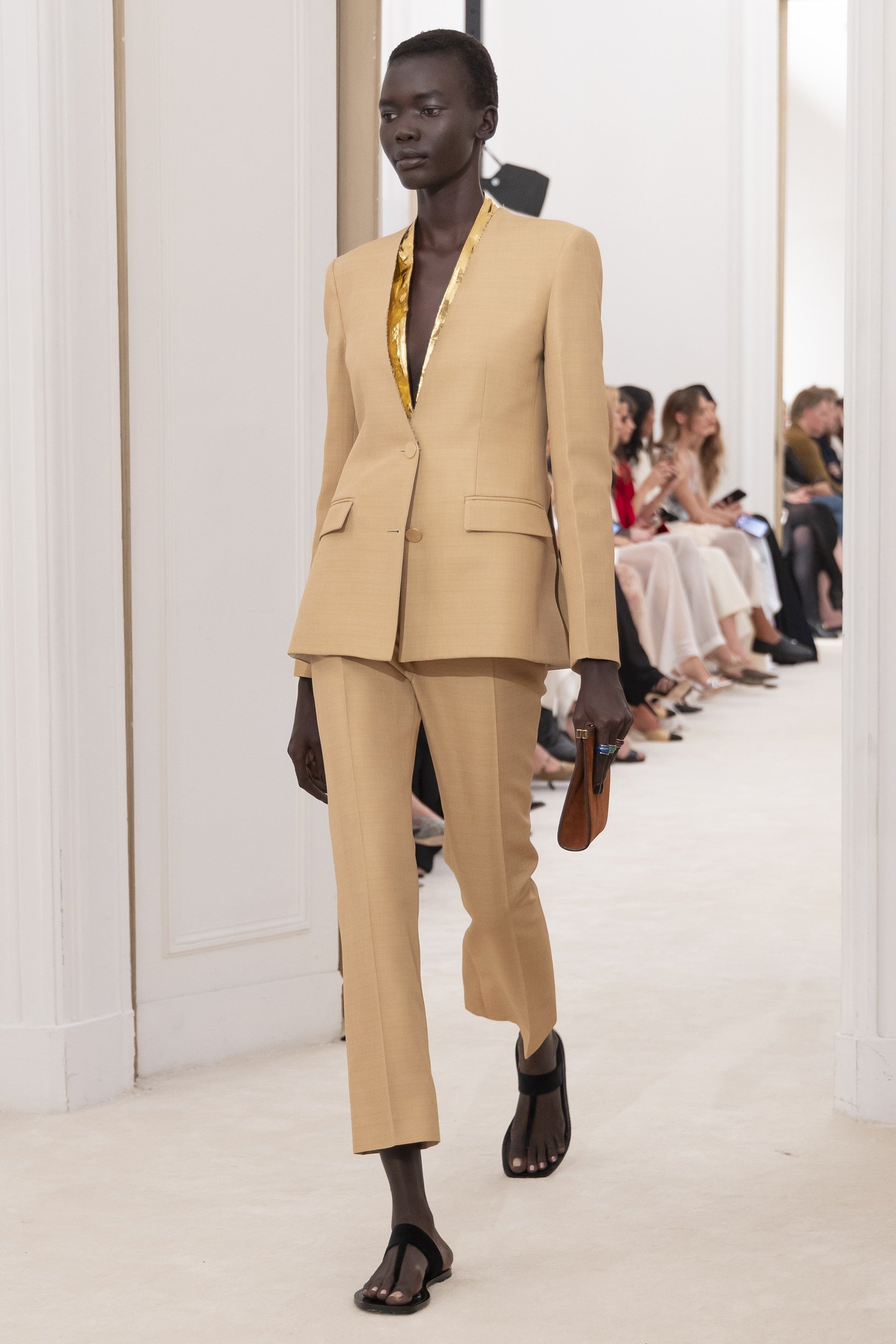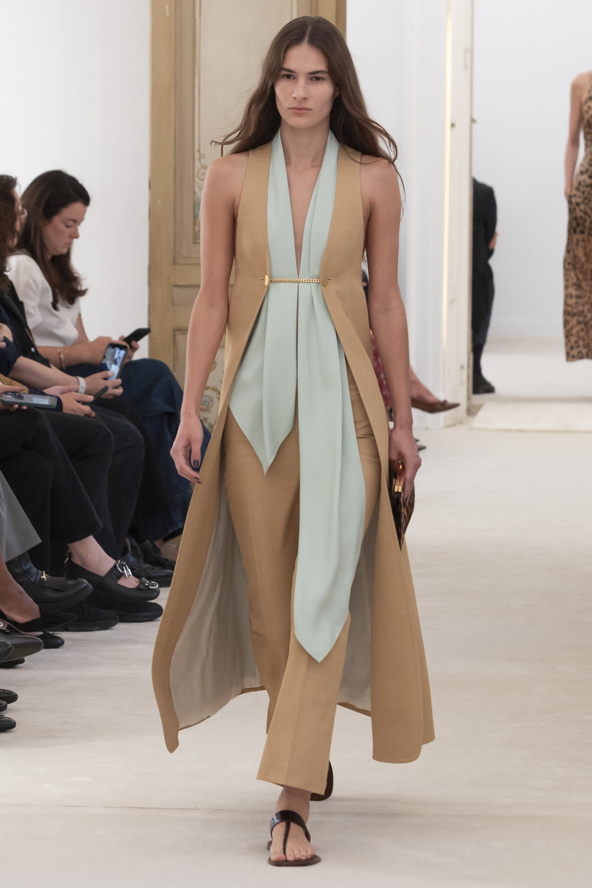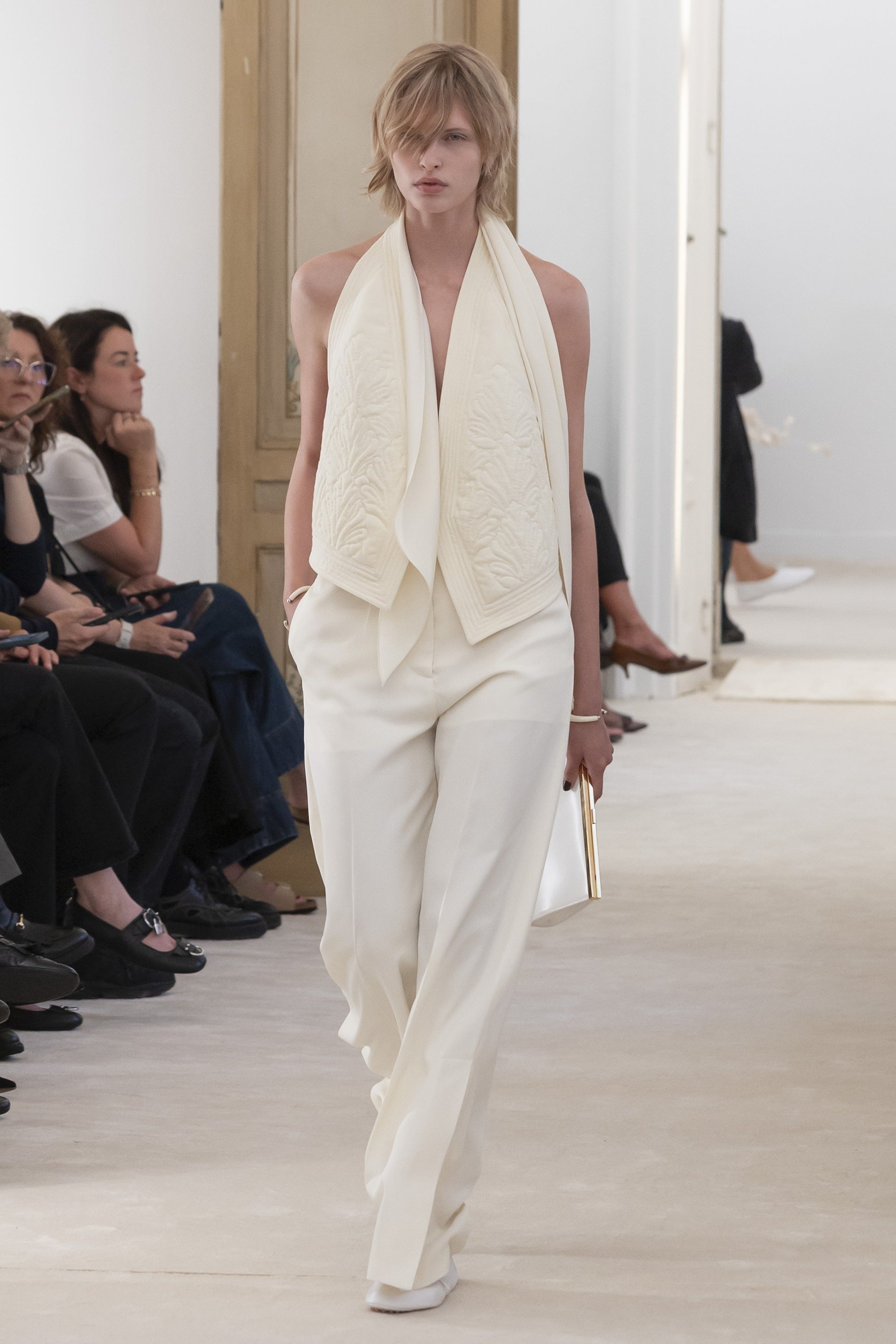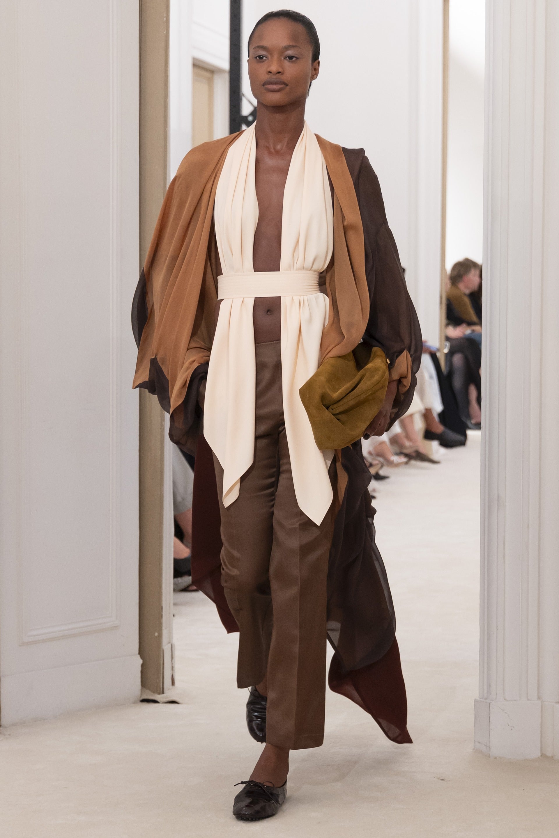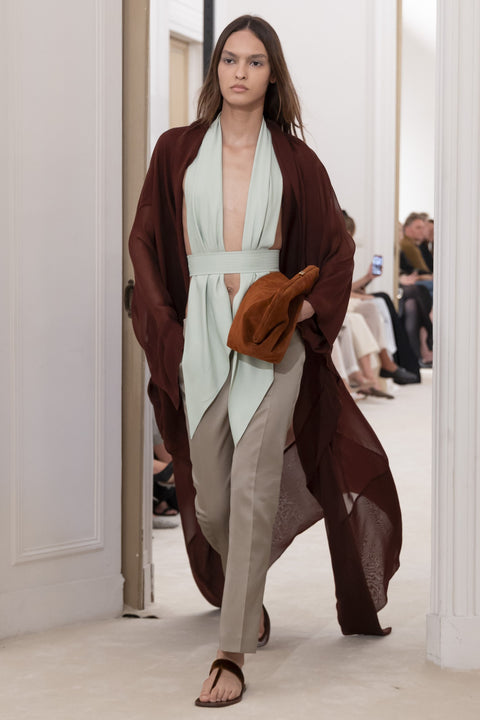 Le tailleur a un esprit assertif. Vestes ouvertes sur gilets et tops soutien-gorge, associées à des pantalons en organza, viscose et lin. De petites capes en organza de soie et lin imprimé tombent avec le poids du drapé, tandis que des chemises transparentes laissent entrevoir la peau.