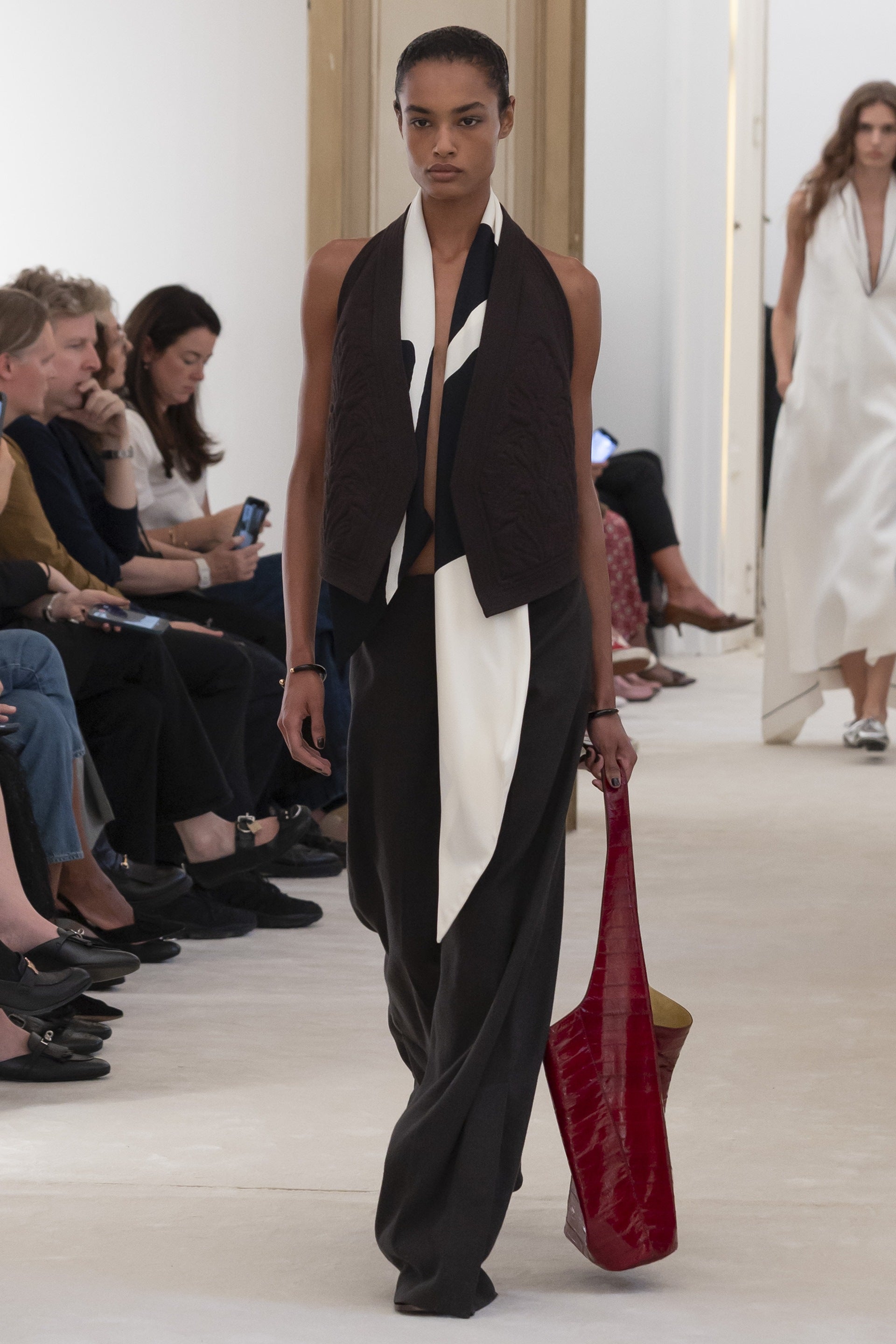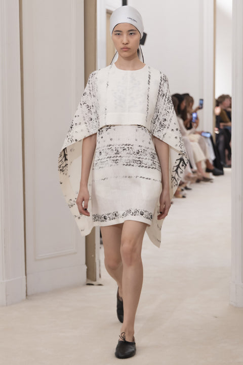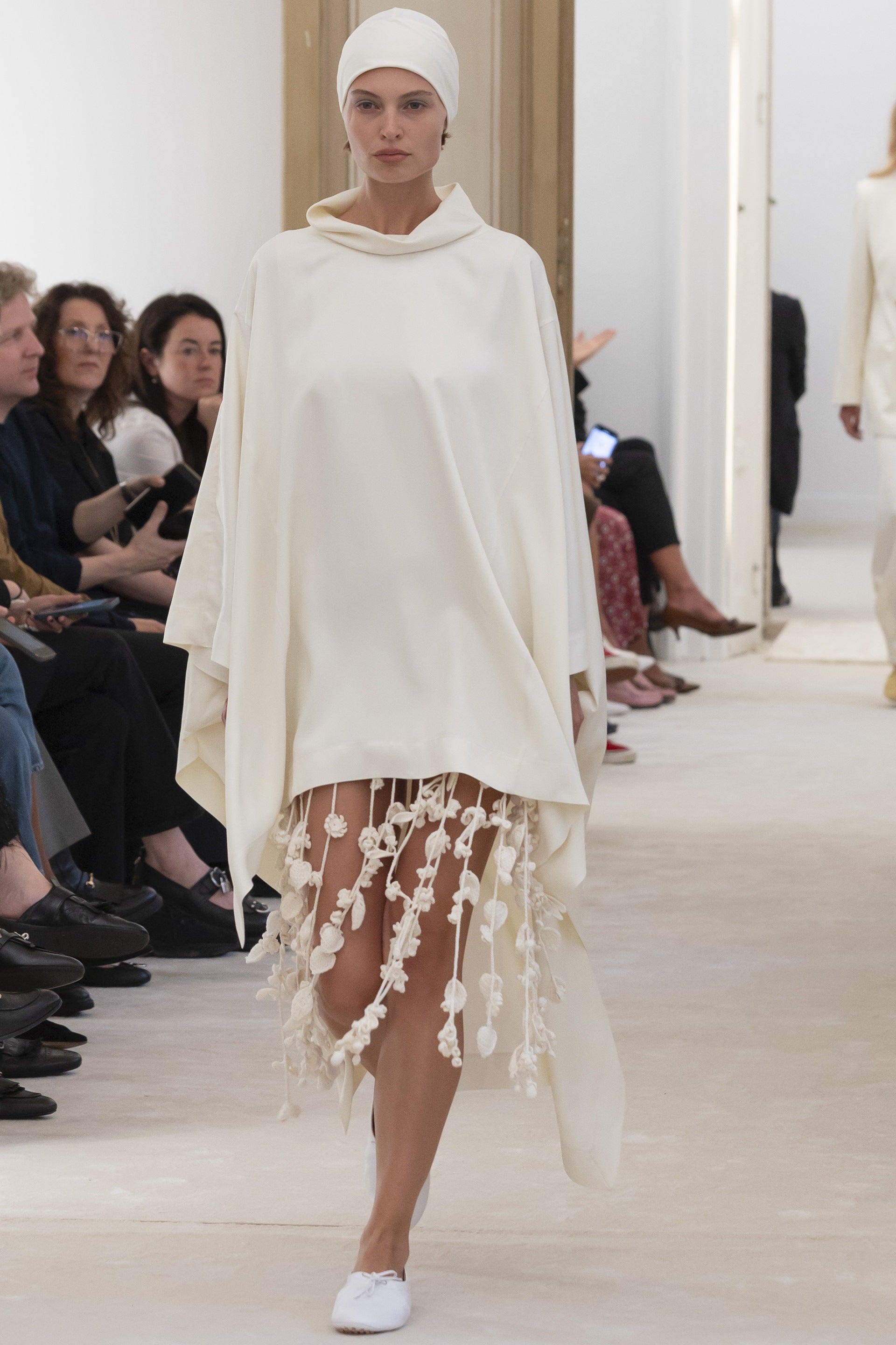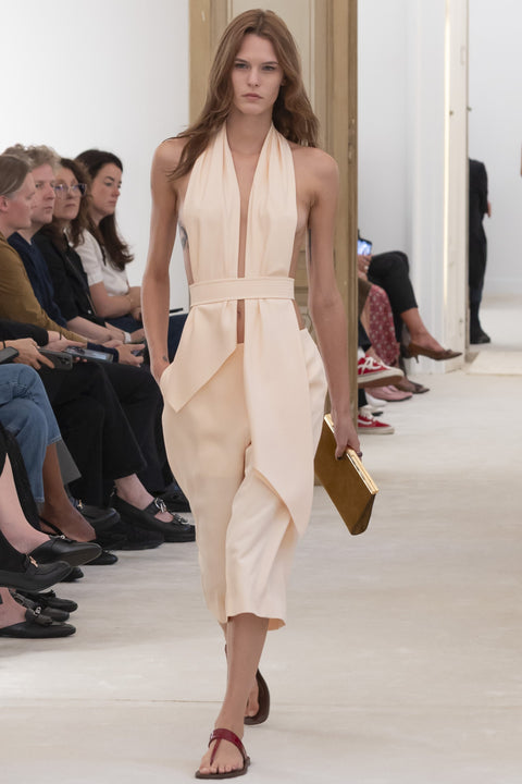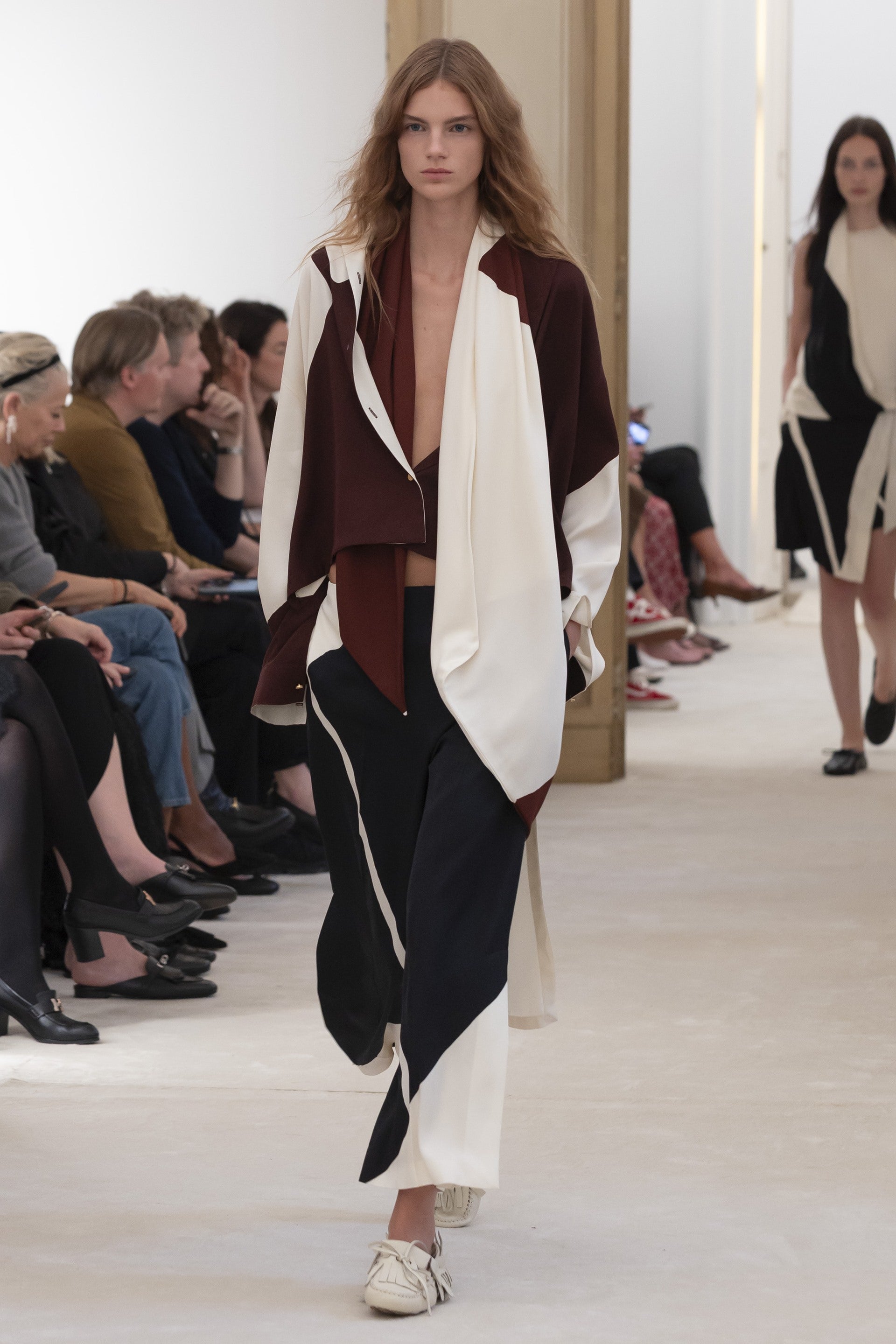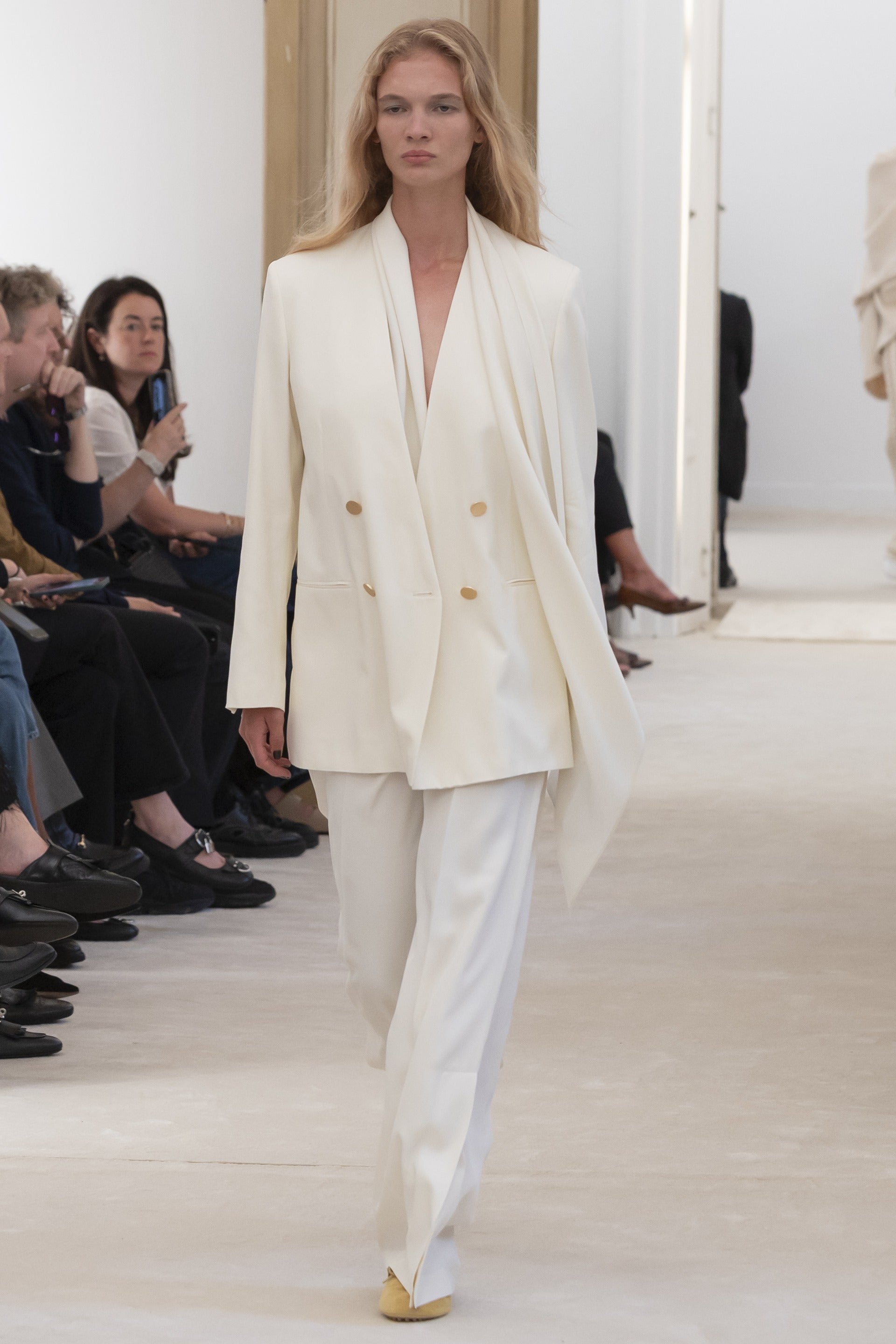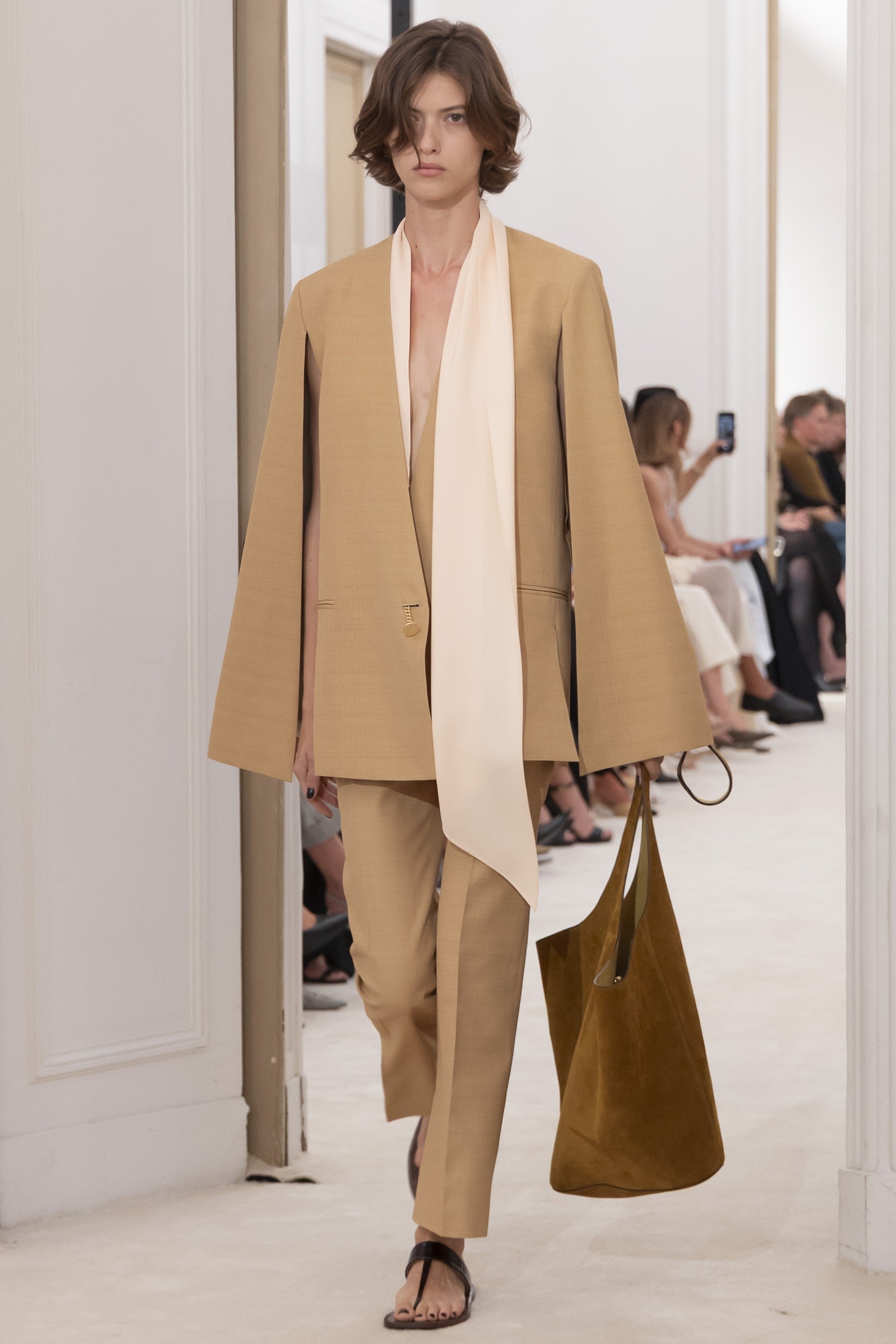 Le tailleur a un esprit assertif. Vestes ouvertes sur gilets et tops soutien-gorge, associées à des pantalons en organza, viscose et lin. De petites capes en organza de soie et lin imprimé tombent avec le poids du drapé, tandis que des chemises transparentes laissent entrevoir la peau.