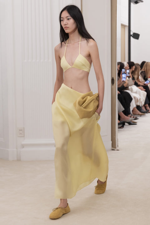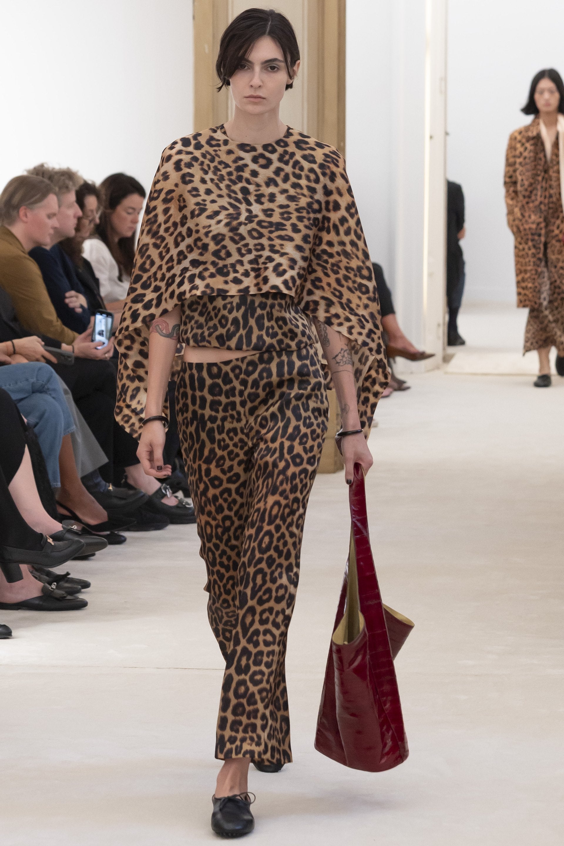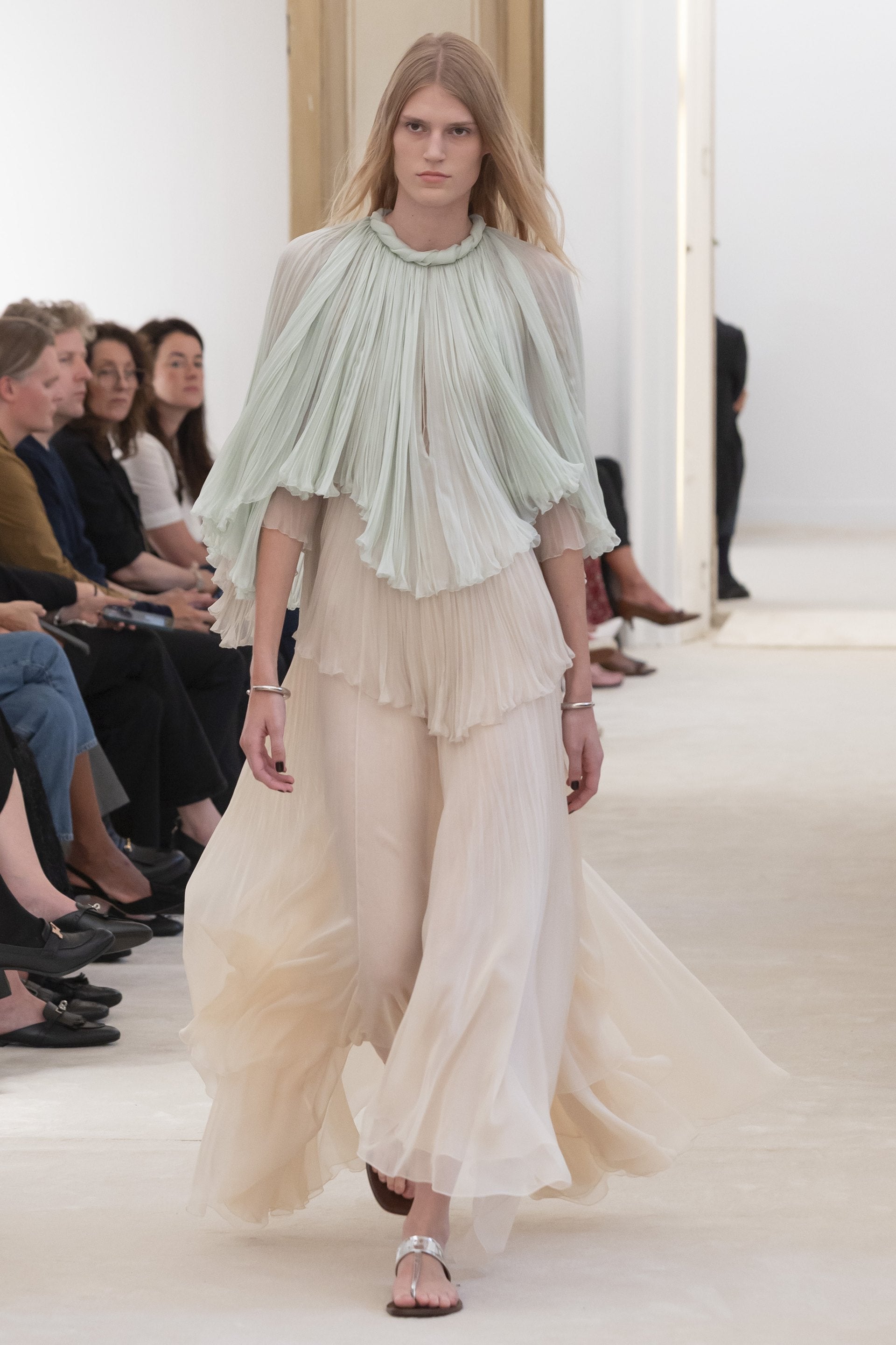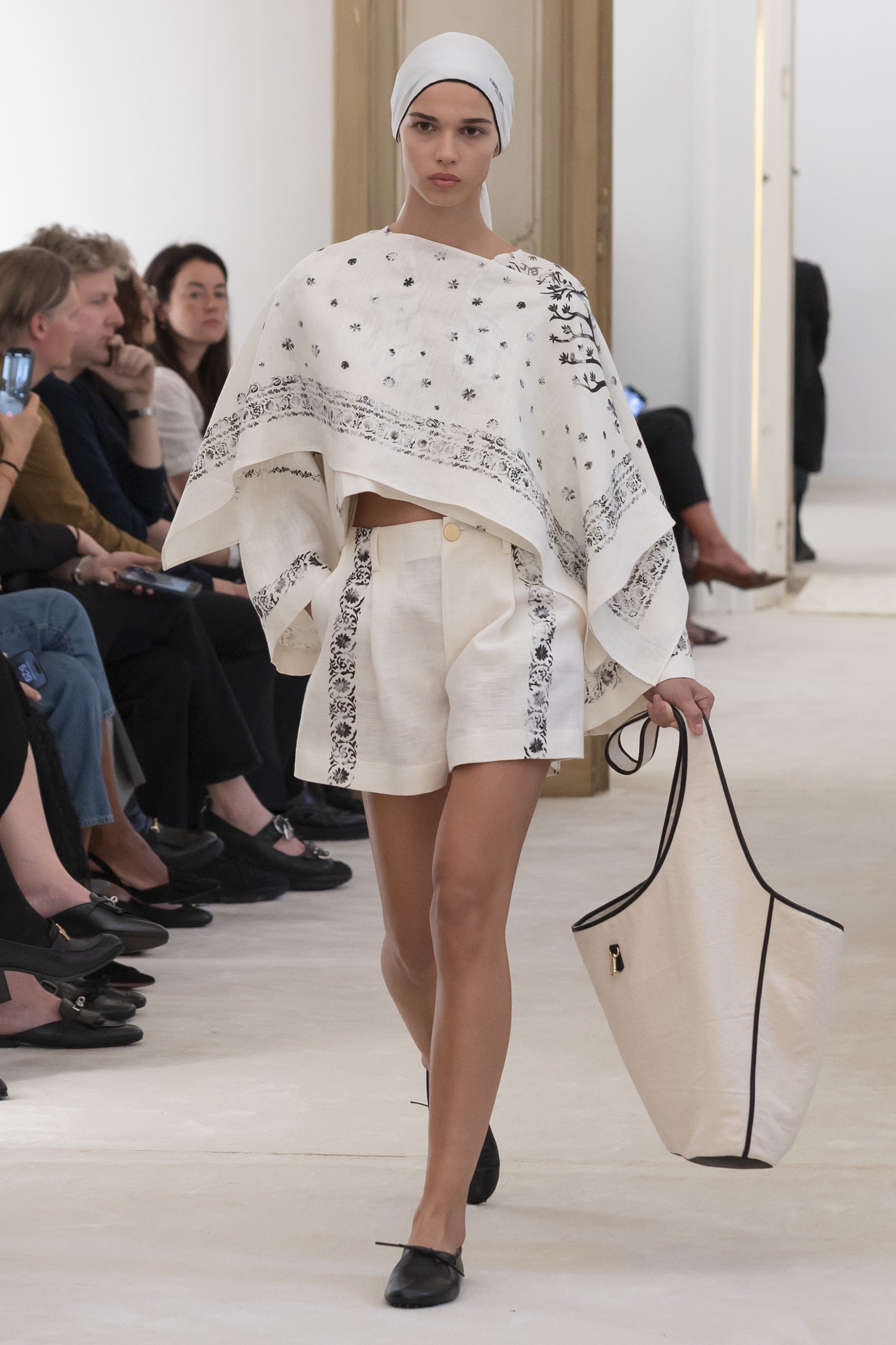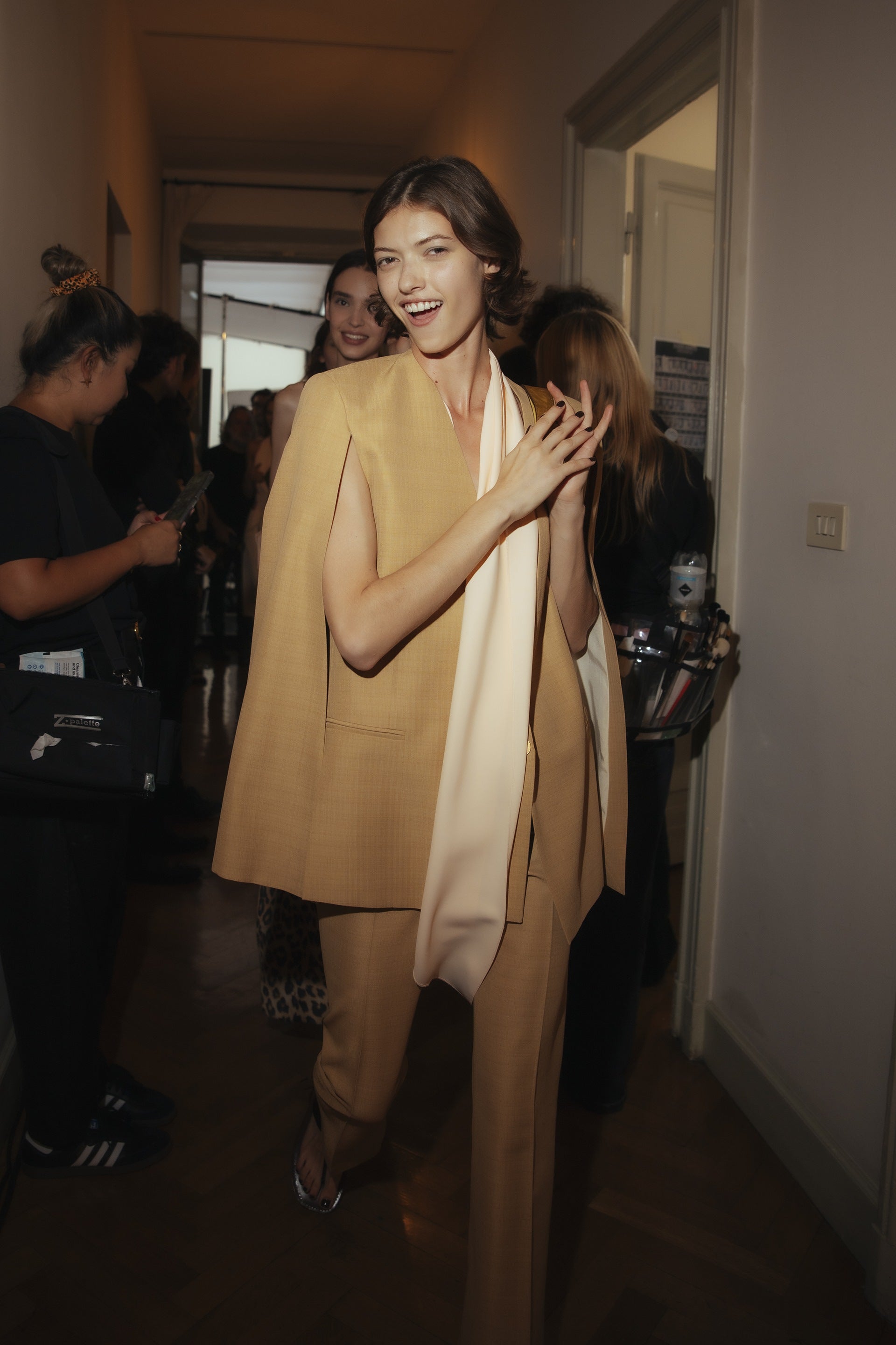 Le tailleur a un esprit assertif. Vestes ouvertes sur gilets et tops soutien-gorge, associées à des pantalons en organza, viscose et lin. De petites capes en organza de soie et lin imprimé tombent avec le poids du drapé, tandis que des chemises transparentes laissent entrevoir la peau.