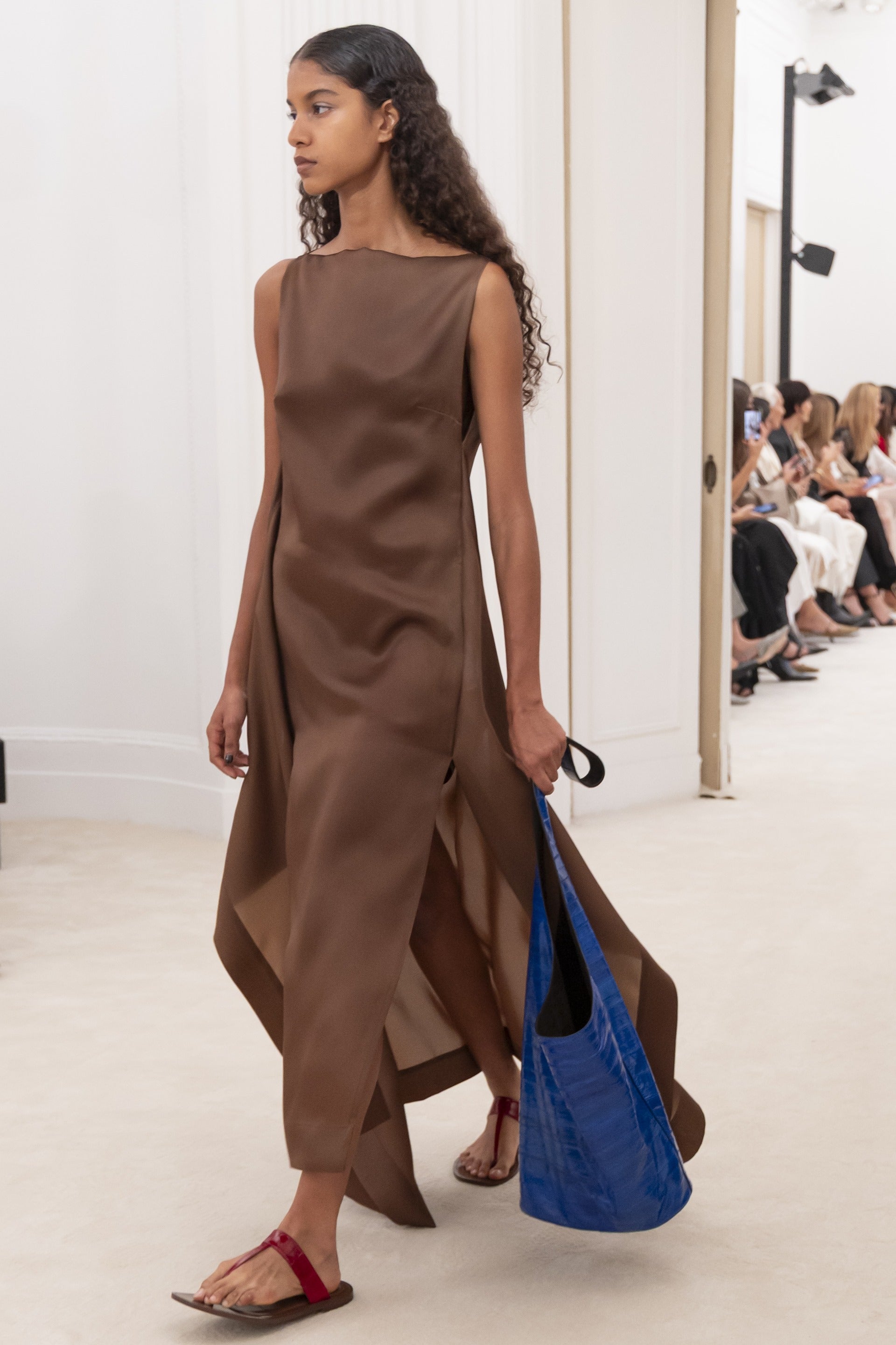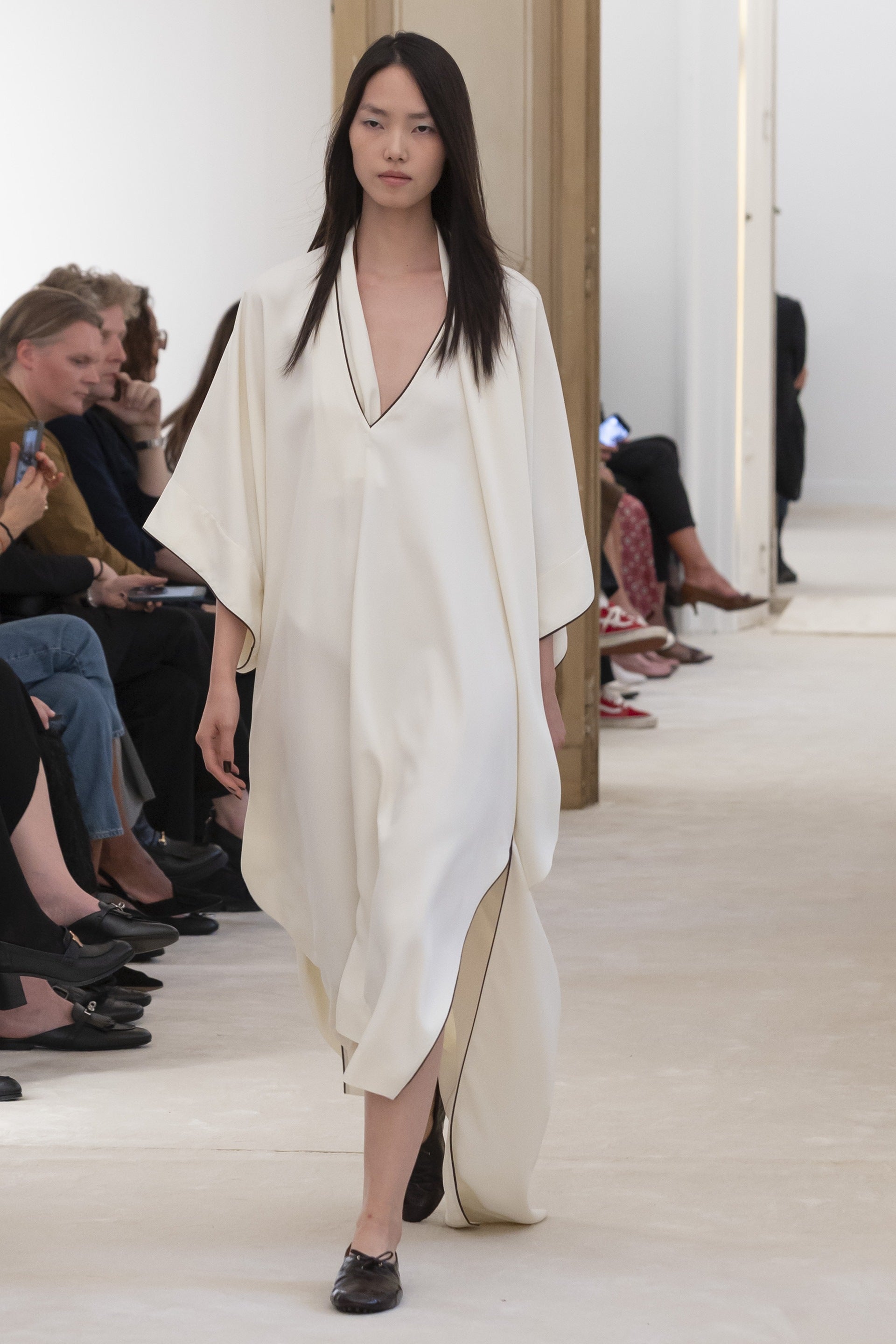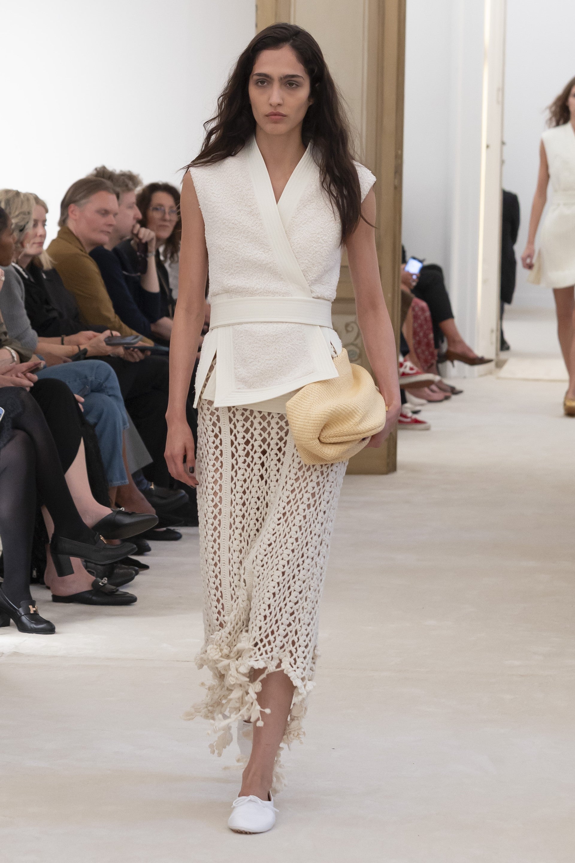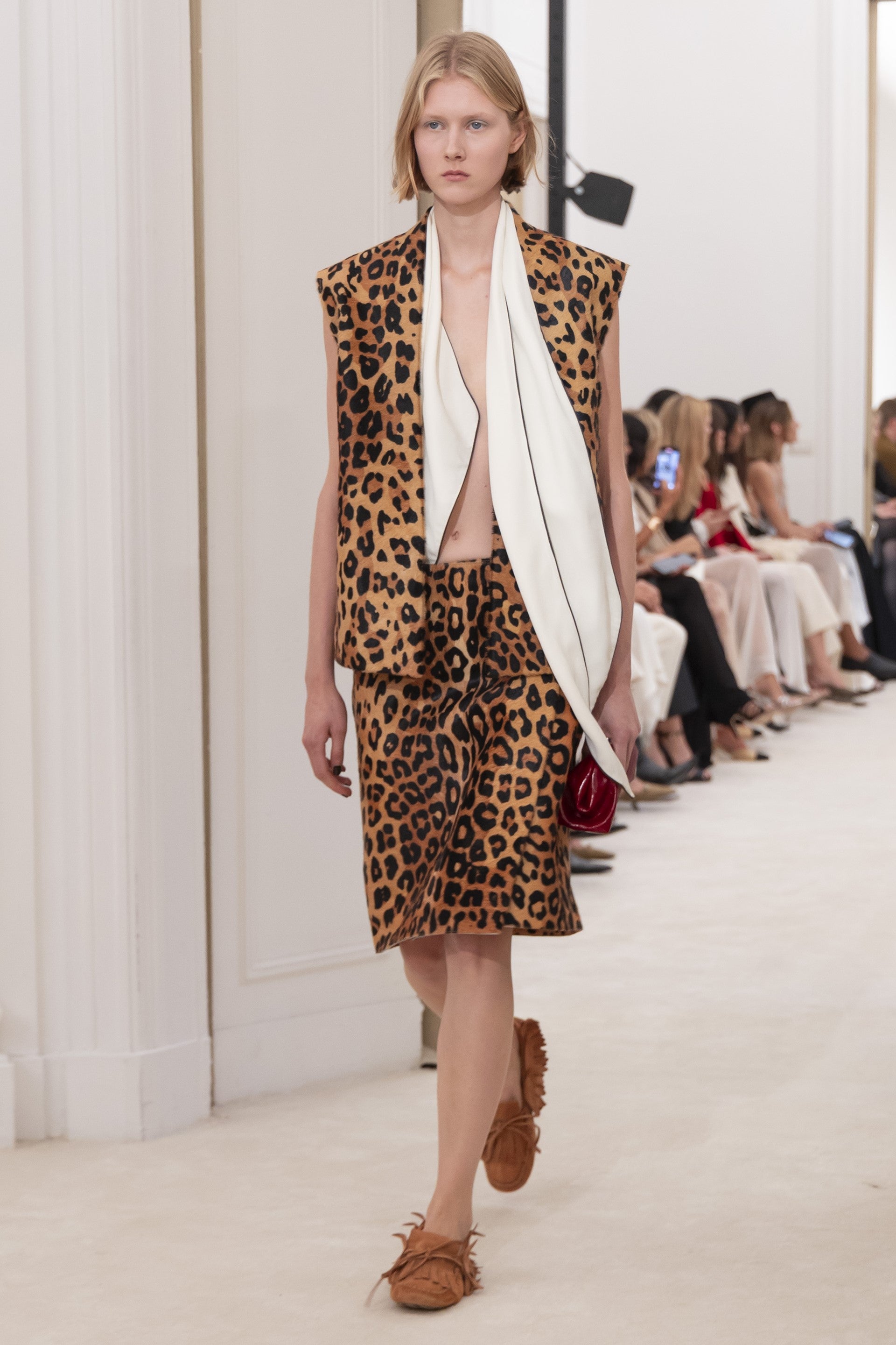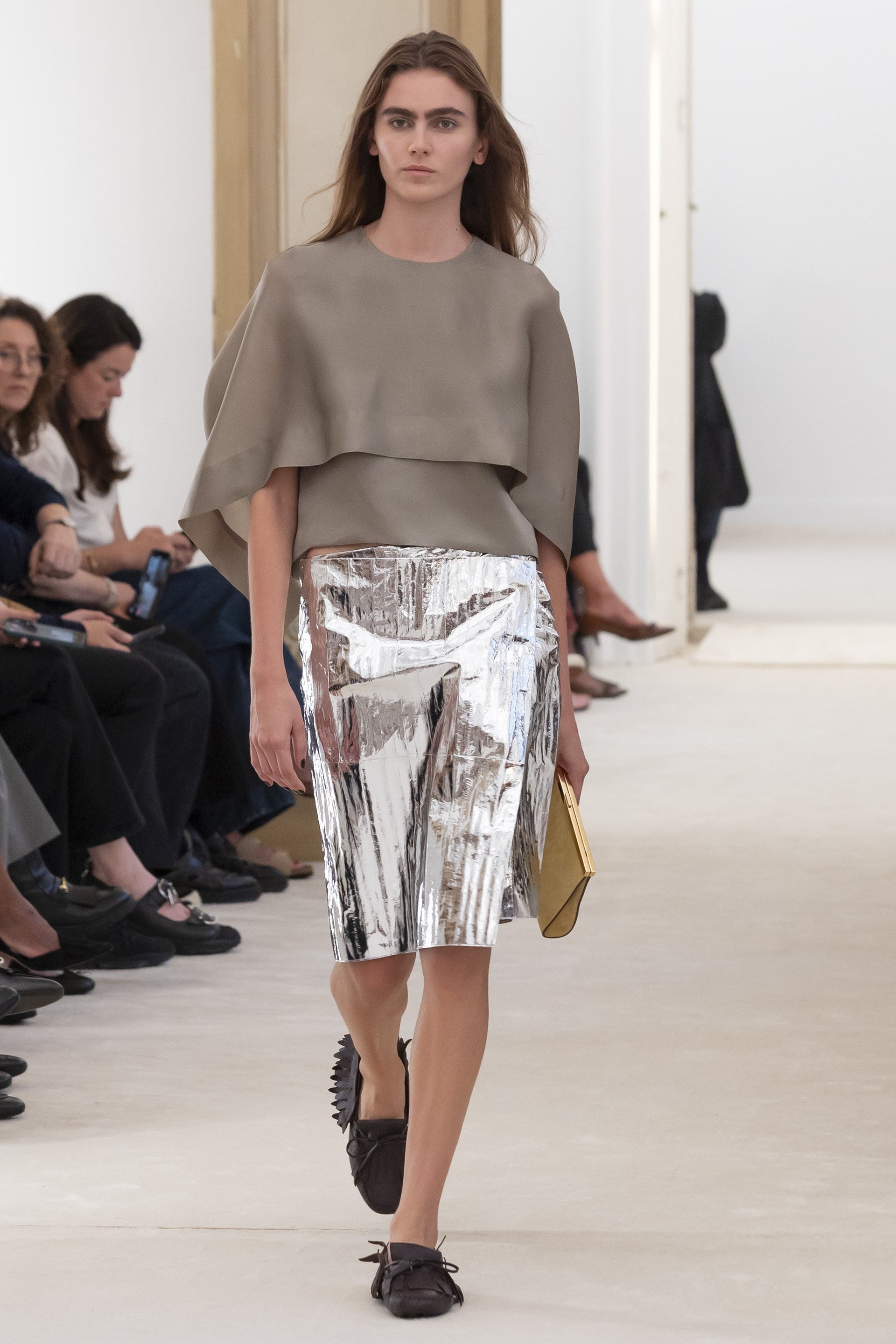 Le tailleur a un esprit assertif. Vestes ouvertes sur gilets et tops soutien-gorge, associées à des pantalons en organza, viscose et lin. De petites capes en organza de soie et lin imprimé tombent avec le poids du drapé, tandis que des chemises transparentes laissent entrevoir la peau.