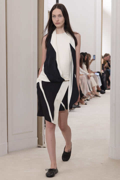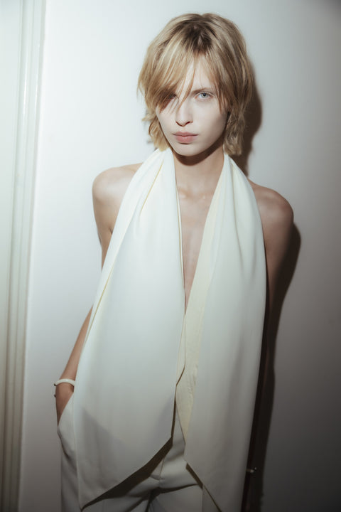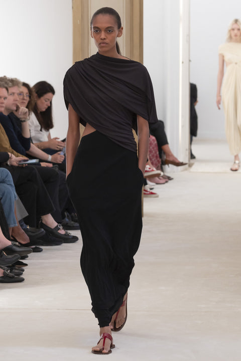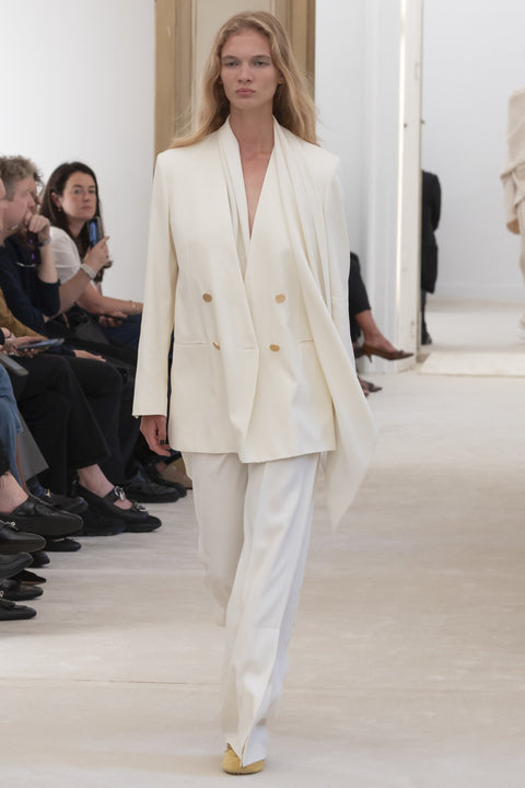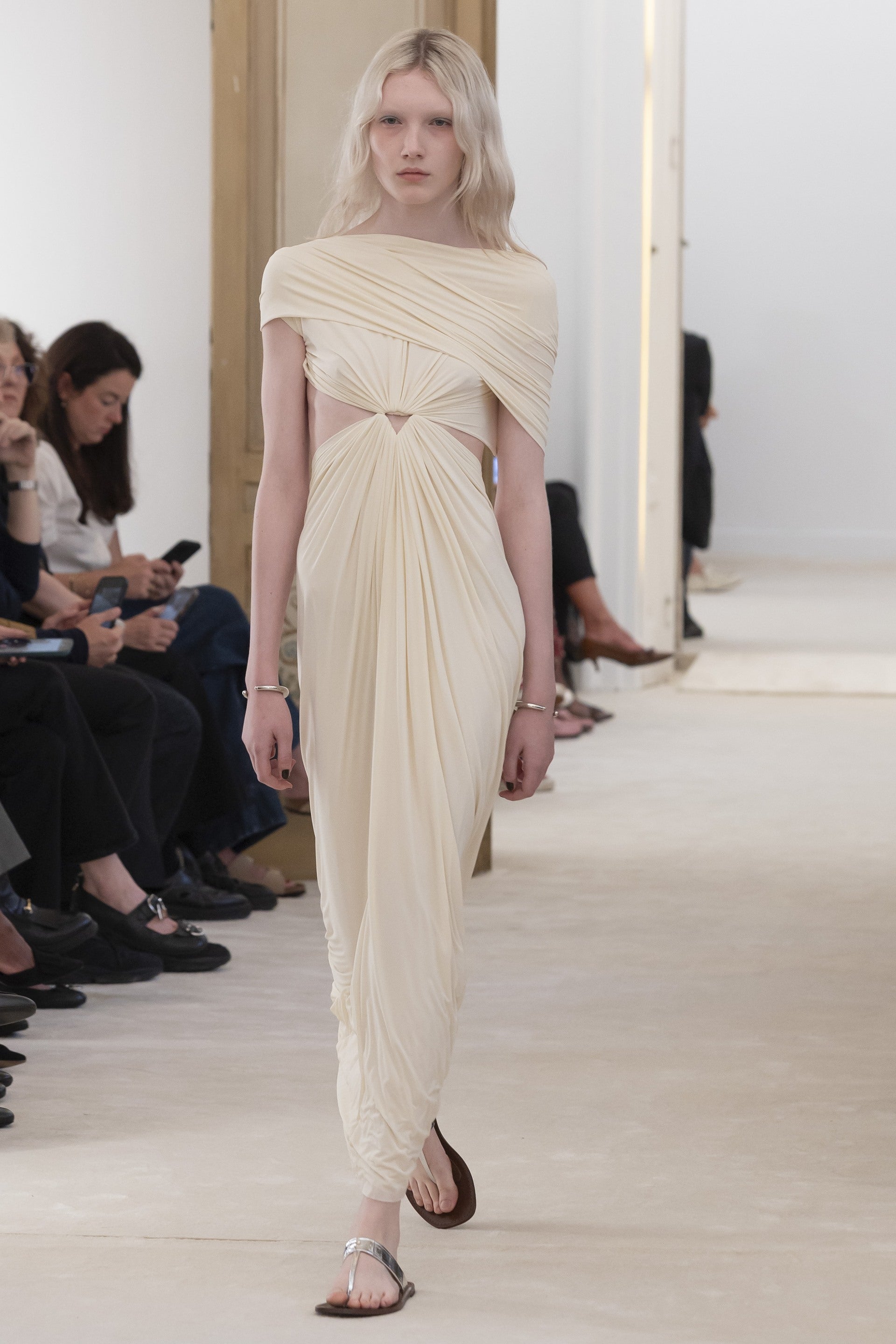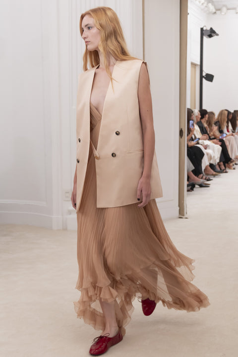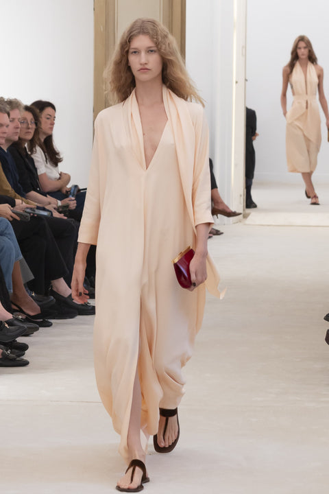 Dans toute la collection, drapés et coupes transforment la douceur en force pour créer un équilibre entre structure et fluidité.