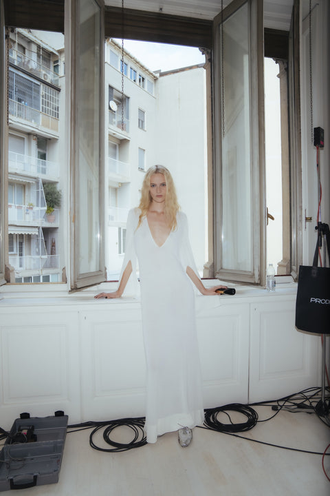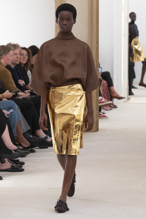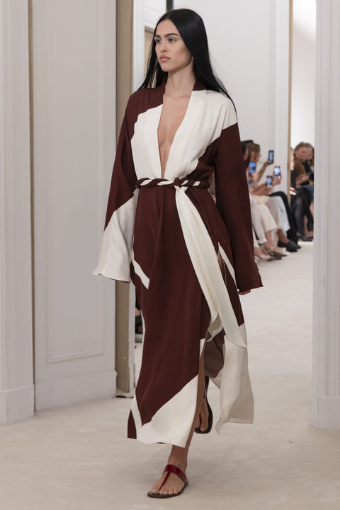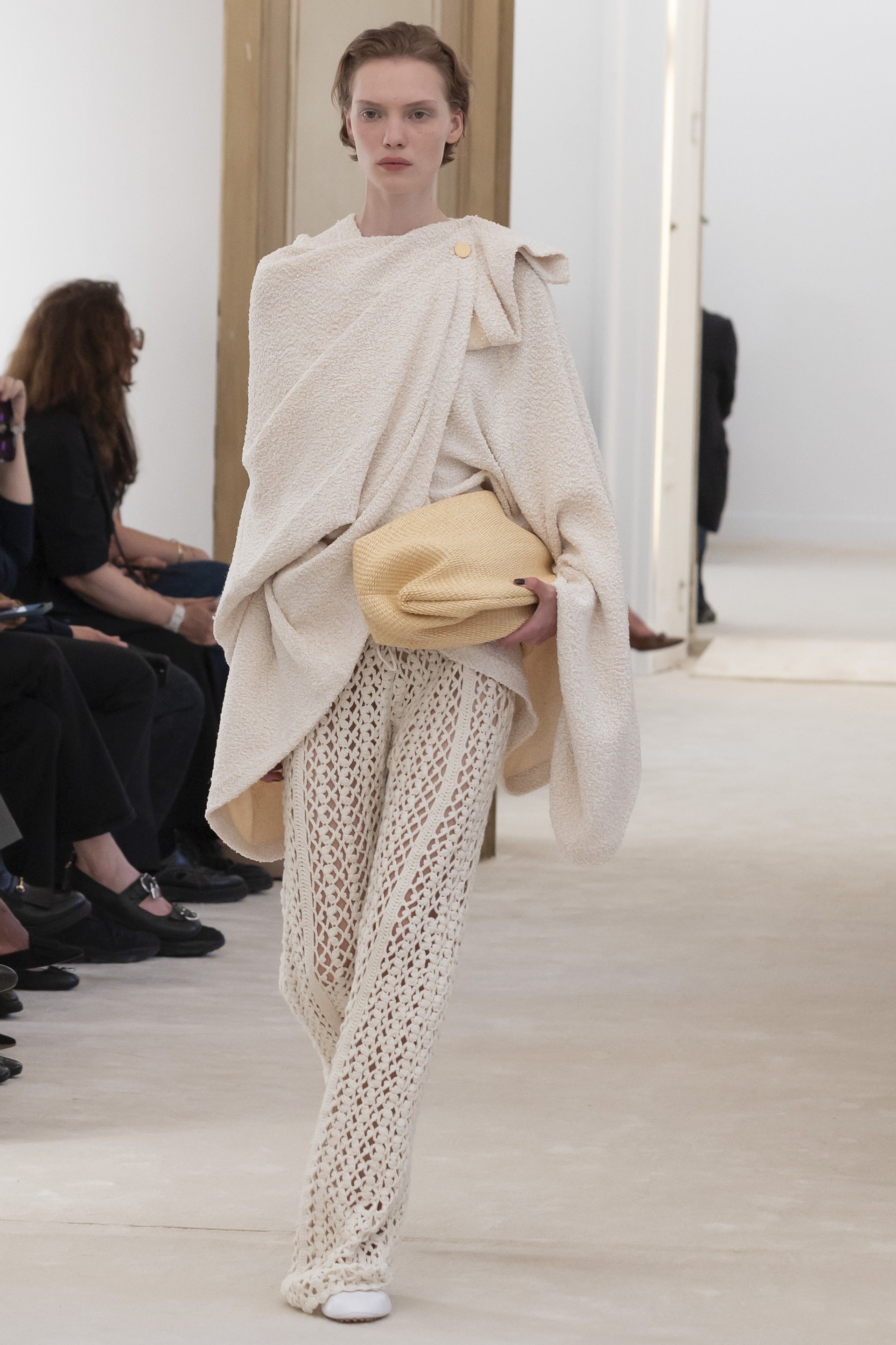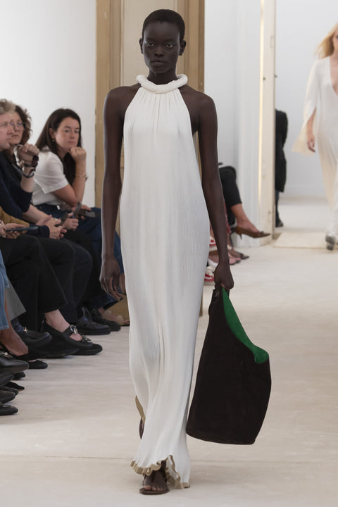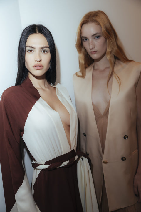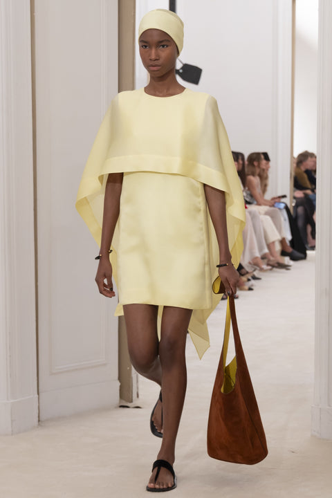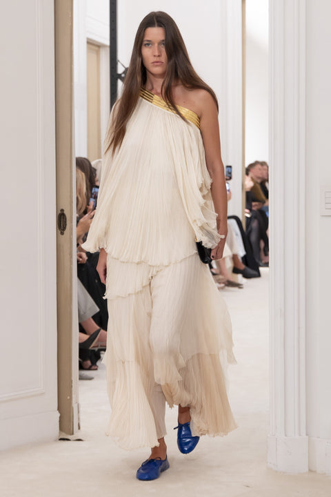 Dans toute la collection, drapés et coupes transforment la douceur en force pour créer un équilibre entre structure et fluidité.
