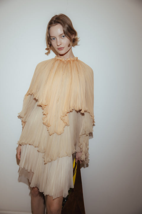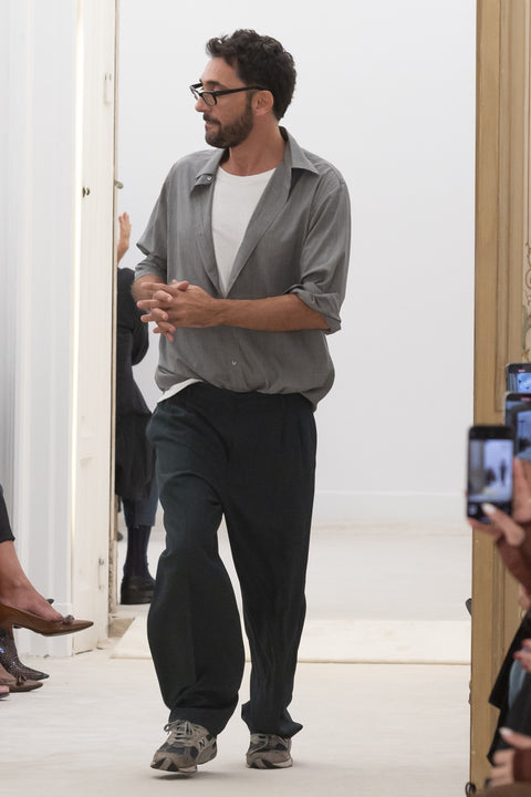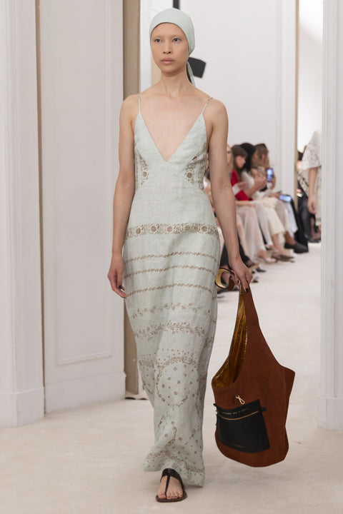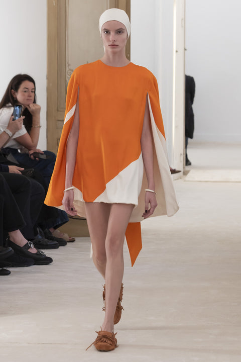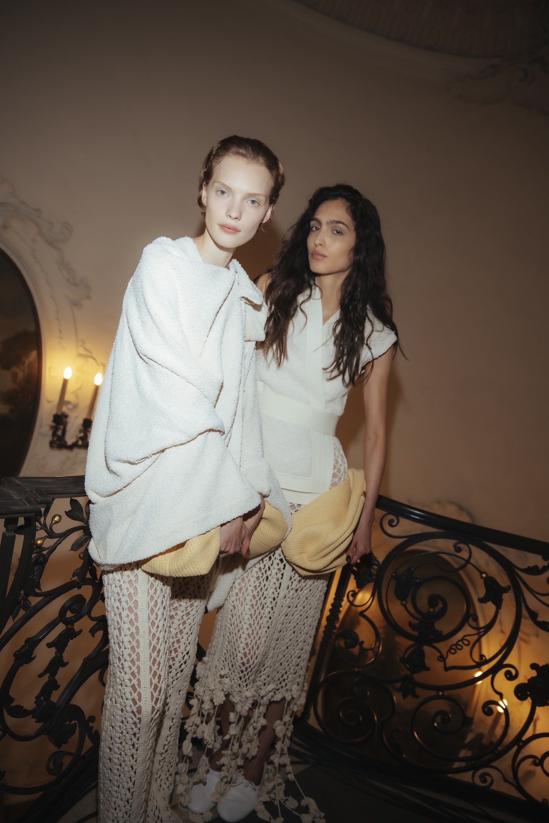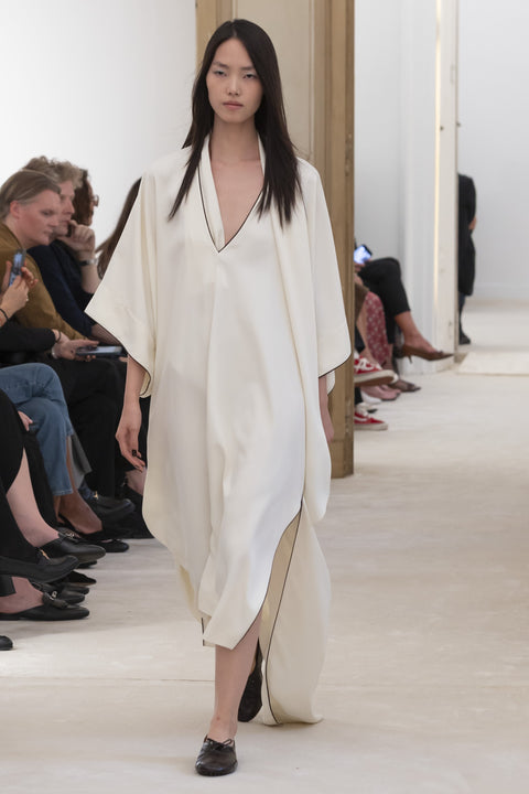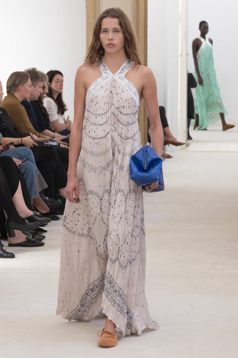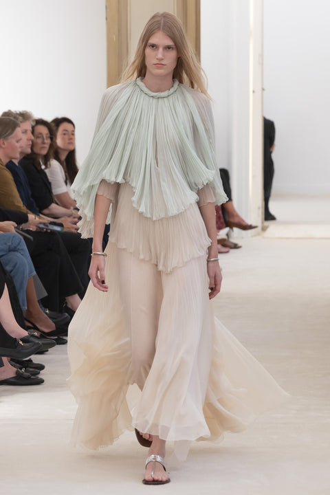 "Alberta Ferretti propose une façon de s'habiller qui donne accès à une approche alternative au style de vie le plus commun aujourd'hui", affirme Lorenzo Serafini. "Nous avons commencé en regardant le romantisme avec des yeux nouveaux. Cela m'a amené à penser à la vie privée comme à un autre aspect de la vie qui aujourd'hui est peut-être négligé. Parce que la vie privée, c'est la liberté : elle vous permet de parler librement, d'aimer librement et de vivre librement. C'est pourquoi il s'agit d'une collection pensée pour une maîtresse de maison dédiée à créer la joie dans sa dimension privée. La valeur de la discrétion - une vie vécue avec satisfaction plutôt qu'avec ostentation - me semble extrêmement puissante et chic. C'est une valeur qui s'associe naturellement à mon idée du romantisme moderne et je crois qu'elle peut influencer la typologie de femme pour laquelle je dessine".
