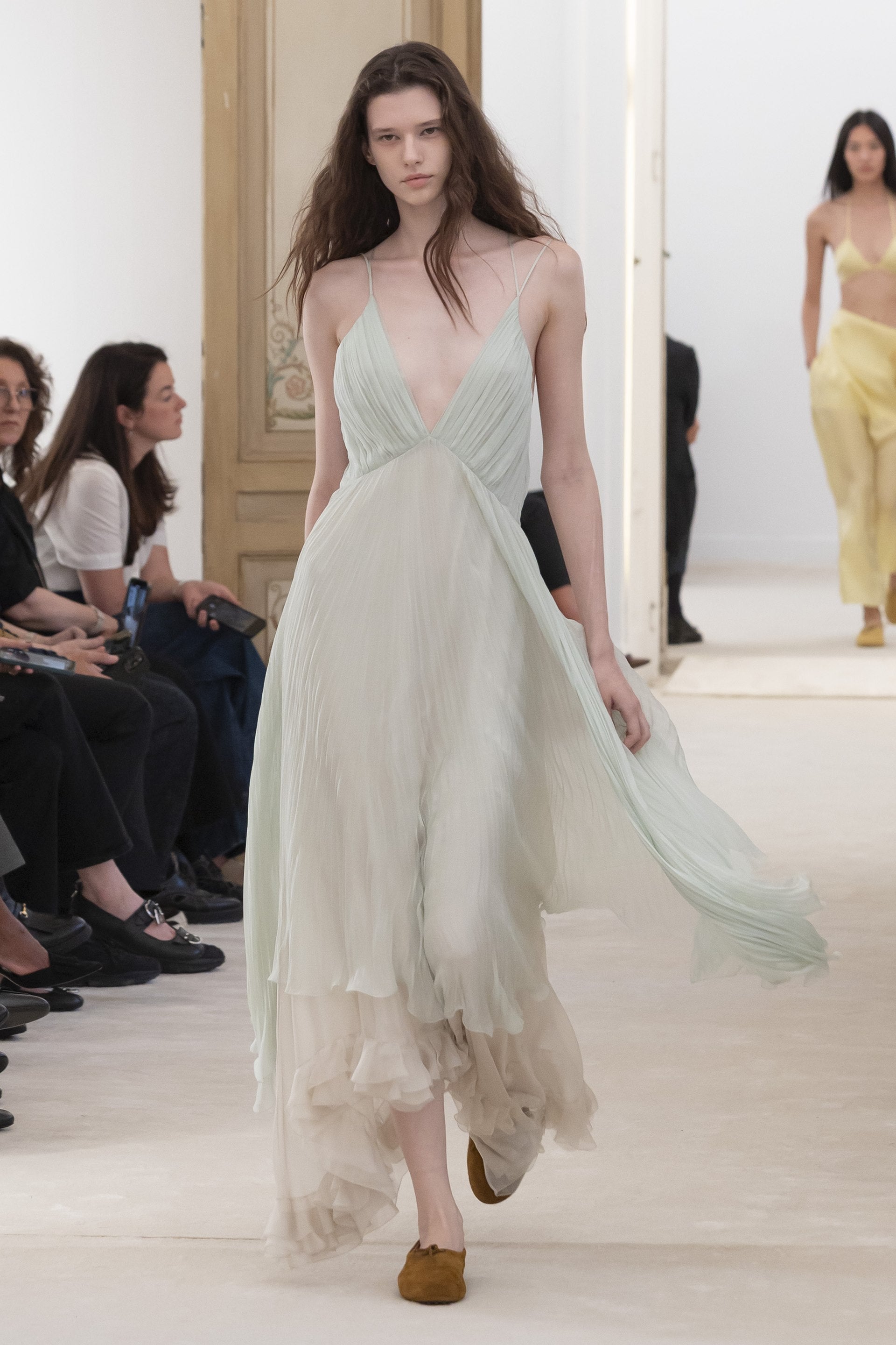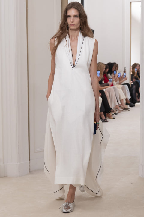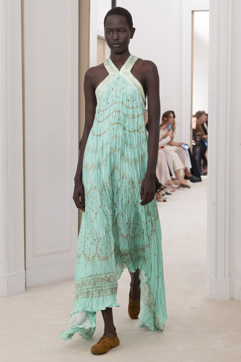La collection Printemps/Été 2026 d'Alberta Ferretti prend vie autour de l'image d'une femme spécifique : une maîtresse de maison qui aime recevoir, mais qui garde jalousement son style de vie pour vivre à l'abri des regards indiscrets.