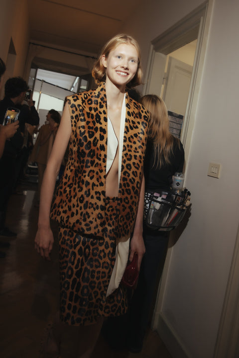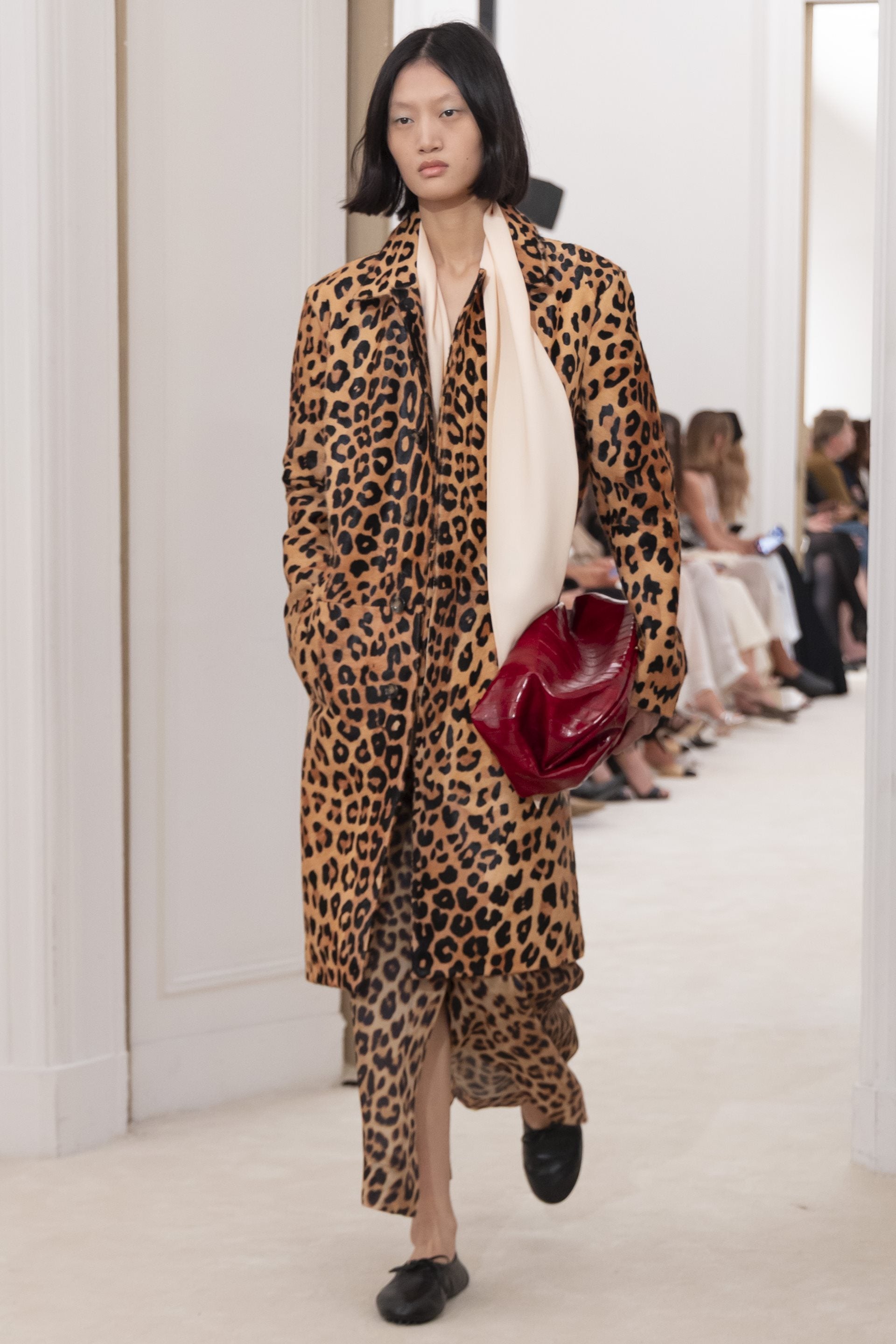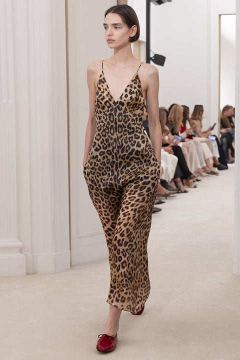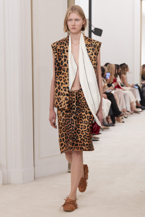 Une macro tache léopard, imprimée sur organza et poulain, ainsi que les touches de métal d'anguille or et argent, ajoutent une touche d'excentricité sophistiquée.