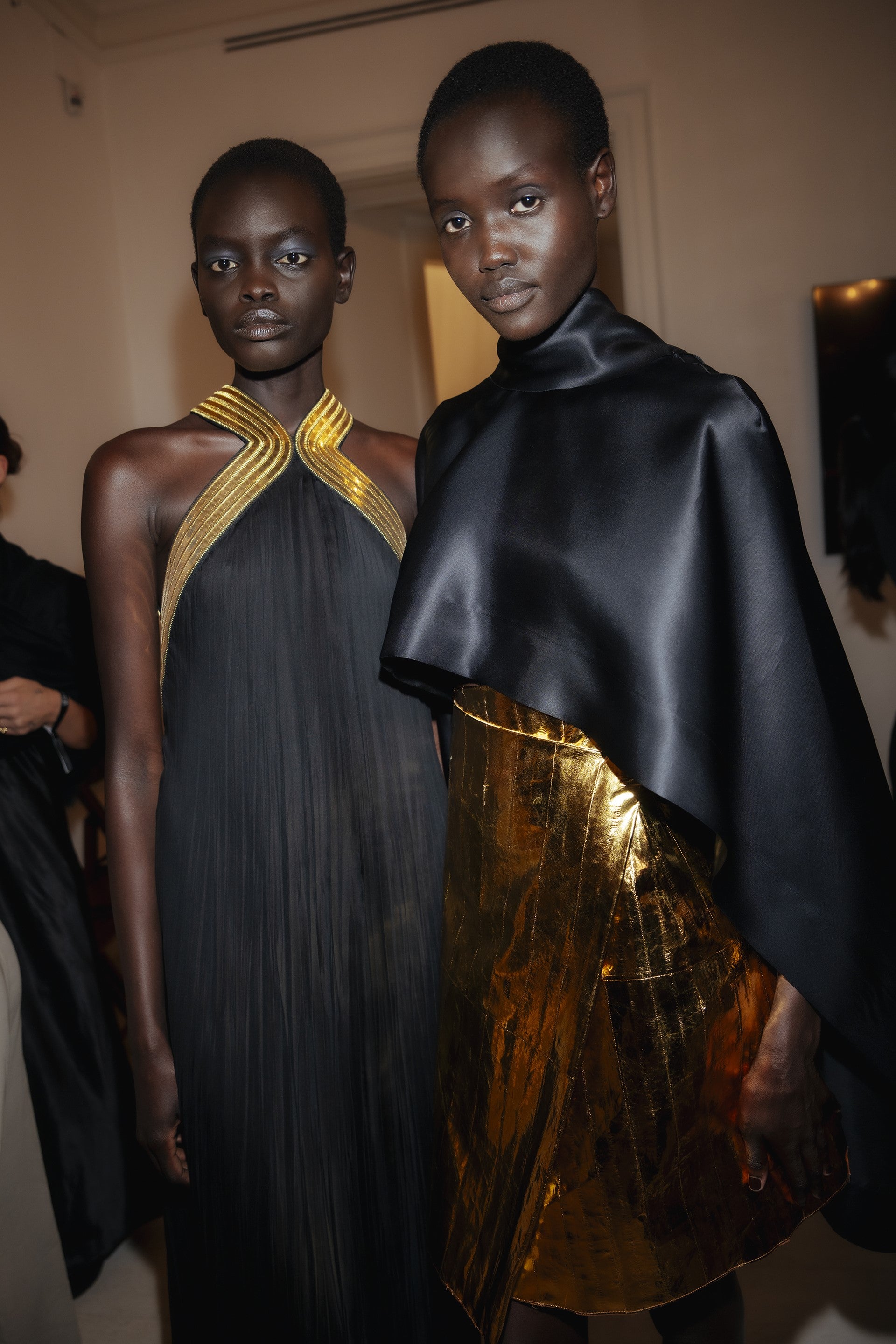 Des robes drapées en bleu et noir évoquent les formes sculpturales des statues grecques, avec des décolletés et des épaules accentués par des éclats dorés. Les robes en mousseline plissée reprennent les silhouettes classiques, leur transparence capture la lumière pour transmettre la sensualité du mouvement libre.